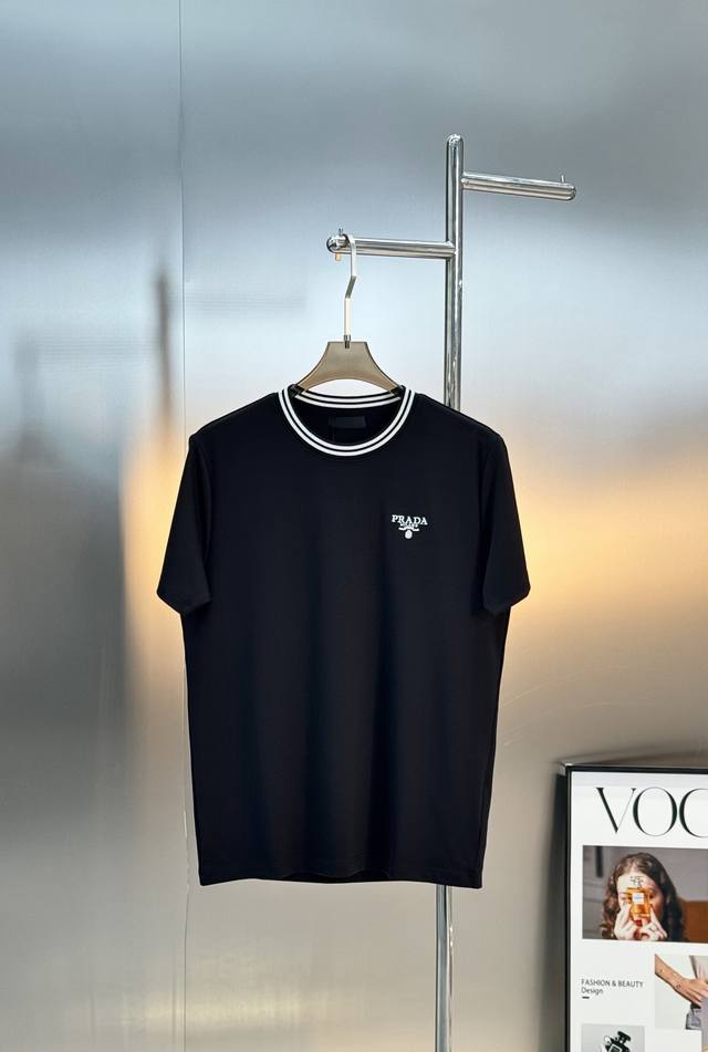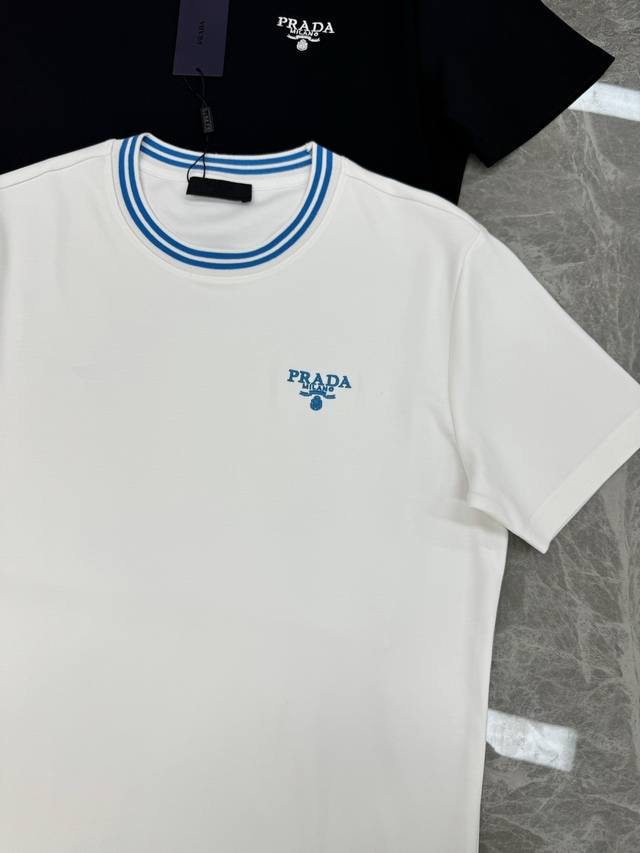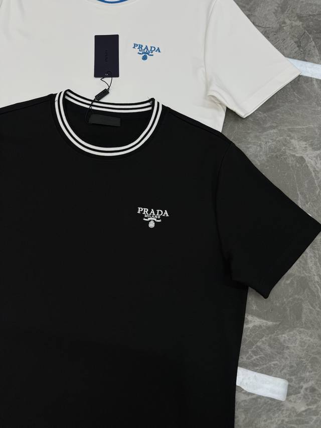 Prada 25S New Modal T-Shirt. Custom-knitted neckline with Prada logo embroidery. The craftsmanship showcases the brand image, and the brand lettering is highly recognizable, enriching the visual appeal and adding a touch of elegance! Made from custom-made 300g modal cotton fabric, the comfortable feel is self-evident, and the texture is excellent when worn! Colors: Black, White. Sizes: M-3XL Slim fit! S and 4XL are available for custom orders. For someone 175cm tall and weighing 140kg, L is recommended.
