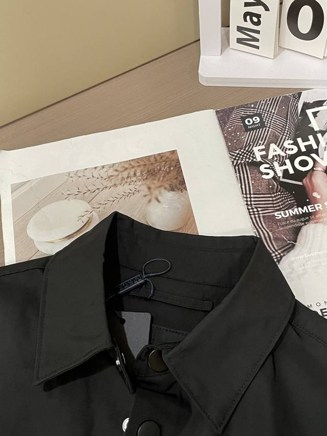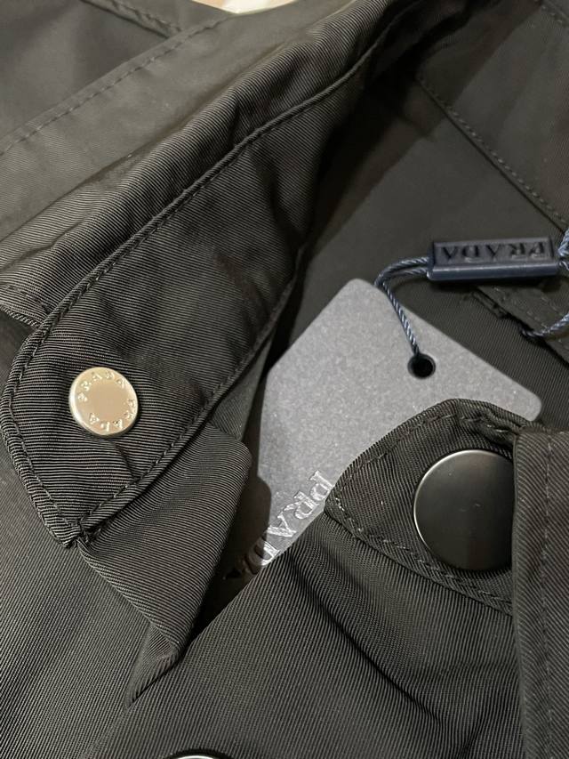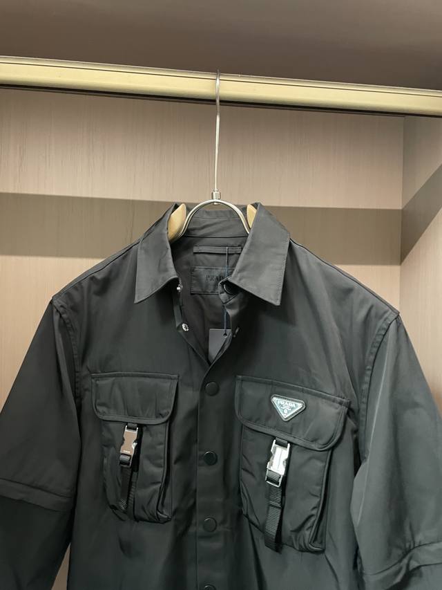 Prada, men's casual jacket. Removable sleeves, embellished with the iconic metal triangle logo, and a structured design that reflects a man's diverse image. The slim, well-tailored fit caters to the current trend of layering and showcases the brand's captivating fashion sense. The details add a touch of understated flair. The cropped silhouette features a slightly ribbed hem. The stiff twill fabric maintains its shape, creating a clean, effortless, and elongated look.