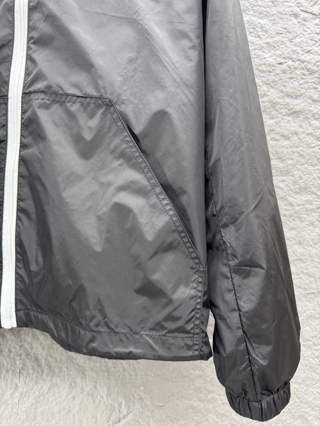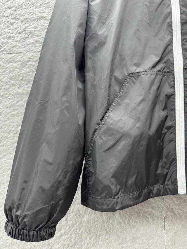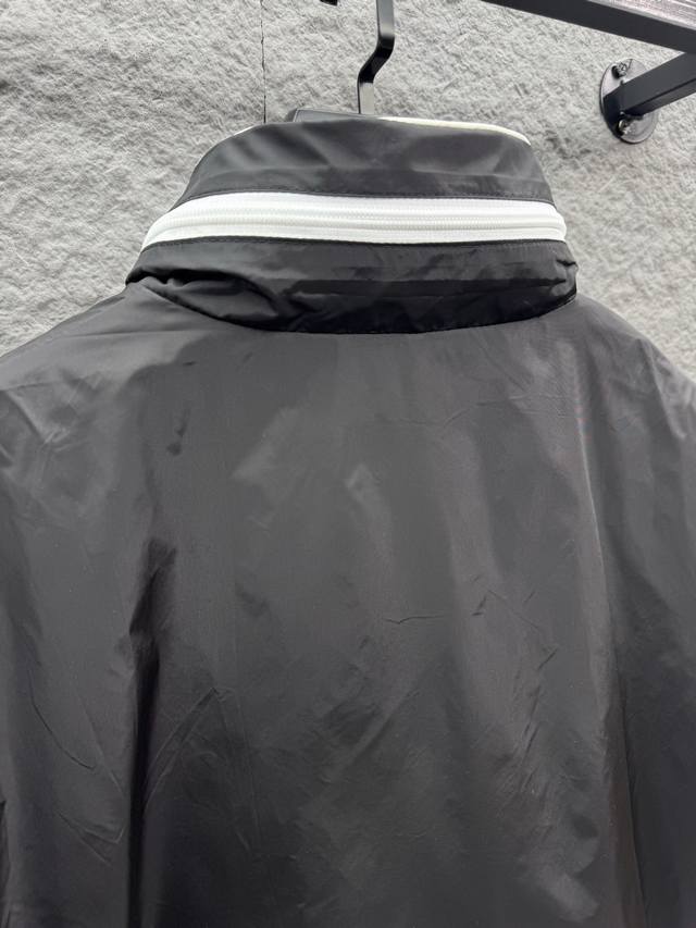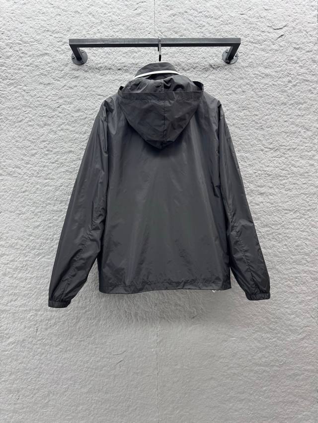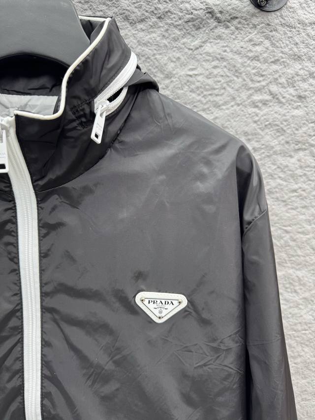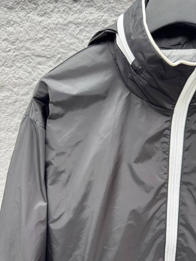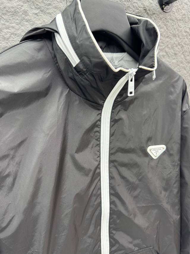 prade25Ss's new stand-up collar recycled nylon jacket blends sporty design with modern style. Its functional silhouette creates a unique look, while the contrasting zipper adds a playful graphic detail. The hood stows for a versatile fit, allowing it to be worn as both a stand-up collar and a hooded jacket. This stylish and fashionable jacket is a must-have in any man's wardrobe and highly recommended! We recommend avoiding frequent washing. Allow it to air dry after each use and have it dry-cleaned by a professional, eco-friendly dry cleaner. Sizes: M-3Xl