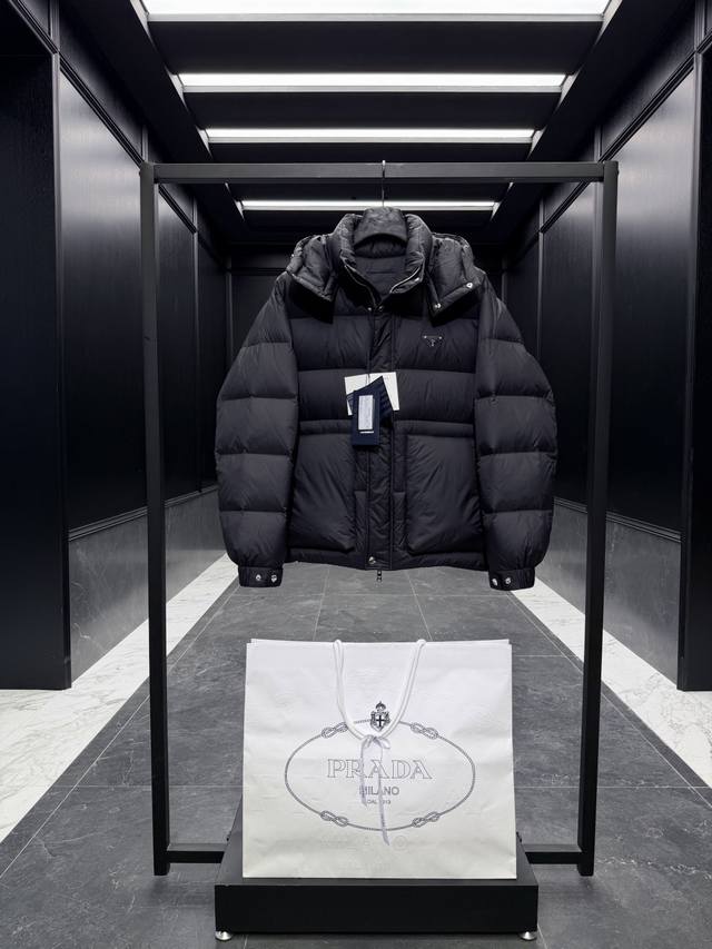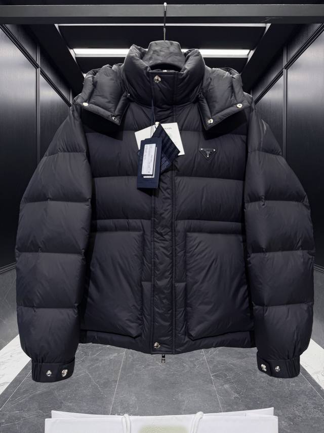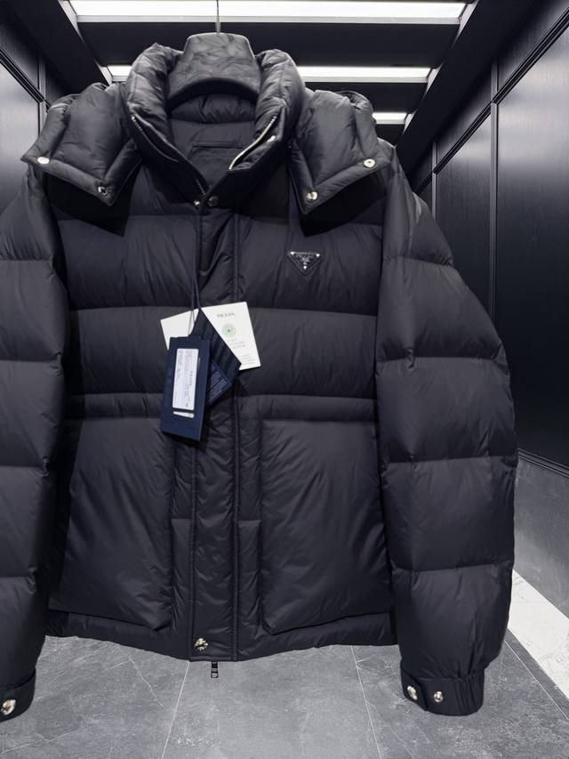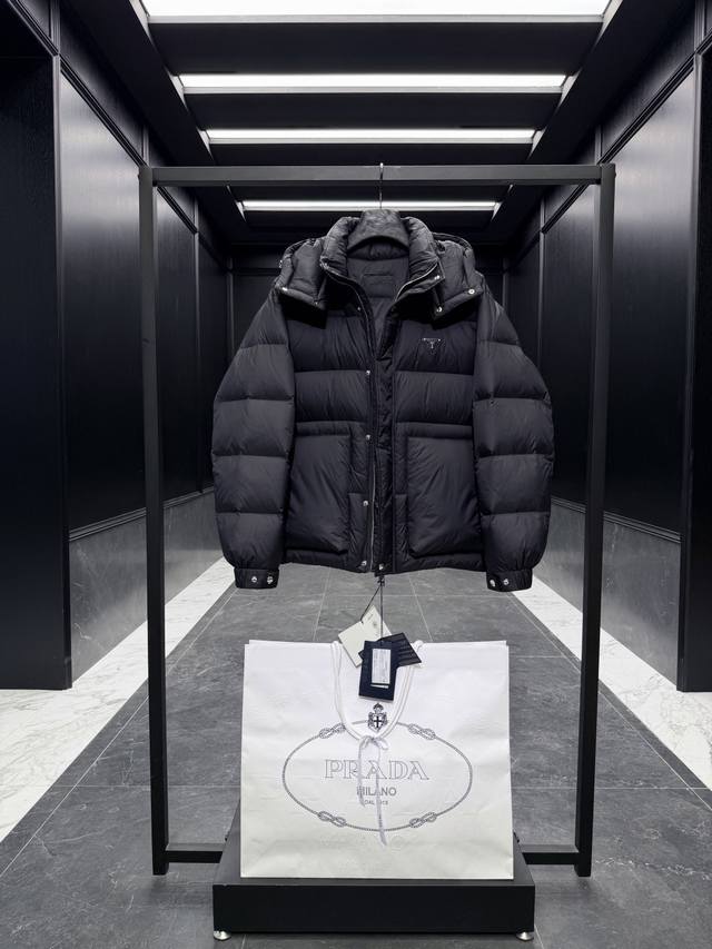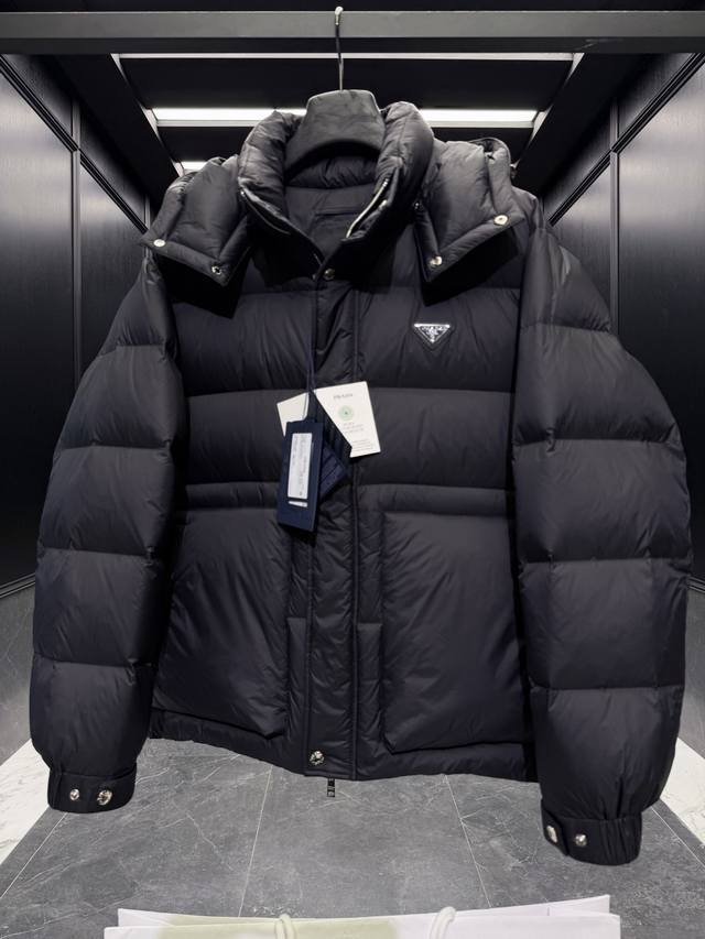 Premium Down Prada Triangle Badge 3D Quilted Hooded Down Jacket. Detachable hood, convertible stand-up collar. Goose down filling. Ultra-lightweight, ultra-soft, tear-resistant nylon fabric. Extremely lightweight and comfortable to wear. Comes with a large tote bag, original nylon suit bag, extra-large box, original hanger, and complete gift box for home delivery. This Prada men's short down jacket is designed for adventure, providing you with warmth and protection. The back embellishment conveys the design concept of a dream staircase. This 3D quilted down jacket is made from lightweight, tear-resistant fabric. DDD Details Ddd Made of nylon fabric Ddd Nylon Laque lining Ddd Double-layered windproof placket Ddd Down filling Ddd Detachable hood Ddd Zipper and snap closure Ddd Zippered pocket Ddd Elastic cuffs Ddd Adjustable cuffs Ddd Elastic drawstring hem Ddd Classic triangle badge logo Ddd Size: 48-56 Black DDD DDD Ddd