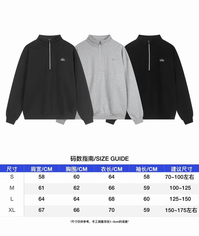 Alo half-zip pullover sweatshirt, custom-made original zipper puller, three complete labels, moisture-free 420g original feel terry brushed custom-woven soft and thick texture original tailoring high-end upper body attention to detail, such as elastic cuffs and hem to prevent clothing from sliding while highlighting the figure, unisex style with matching pants