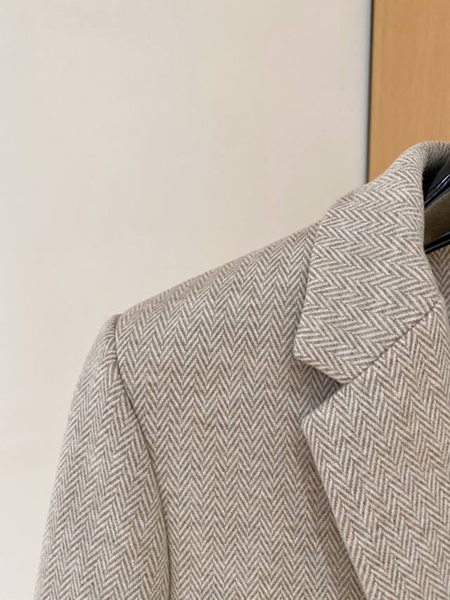 fabric features a finely striped texture, adding a sense of depth and refinement, while also imbuing the jacket with a vintage flair. The