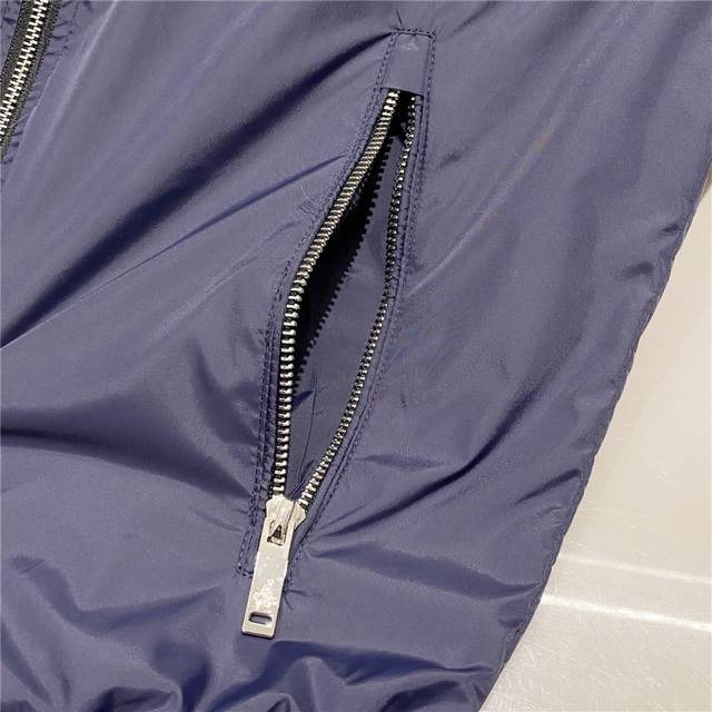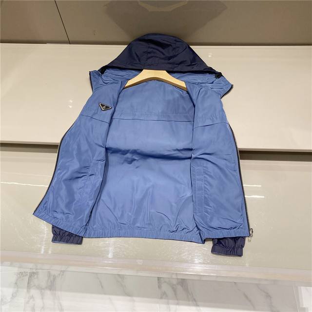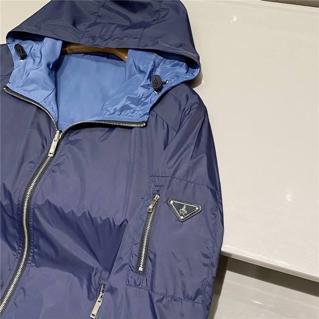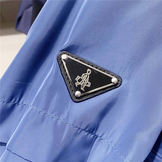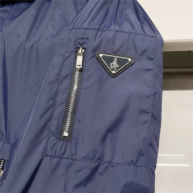 Reversible, this Lr-Mx009 nylon outerwear jacket features a classic triangle logo and is a top-tier outdoor design for men. This waterproof, laminated jacket is a re-introduction of the classic Prada Linea Rossa jacket, reimagined as an iterative, technologically advanced collection. This is clearly the flagship of the Prada Linea Rossa outerwear line. Prada's distinctive triangle logo is a timeless style, and longtime customers know the reliability of their products. This style is a yearly hit. This jacket features original high-density nylon fabric and a size 8 zipper, showcasing a retro and stylish aesthetic. The jacket features exceptional craftsmanship and meticulous workmanship, creating a truly unique experience. It combines a business-like feel with a casual flair. This jacket is in perfect condition, with meticulously windproof hems and hoods. The hooded collar makes it practical for all seasons.