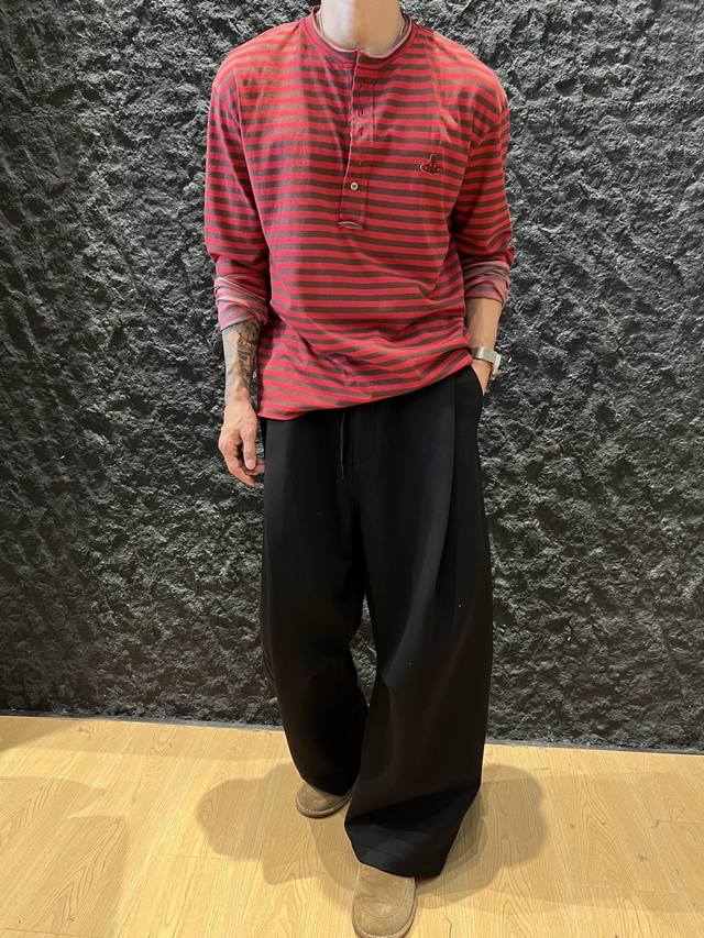 The Empress Dowager's new men's double-layer collar, raw-edge striped Henry collar long-sleeved T-shirt for early autumn 2025 is here!