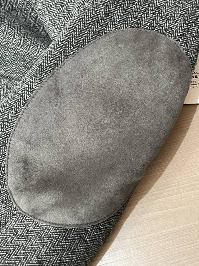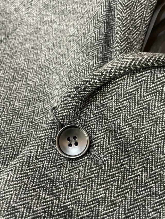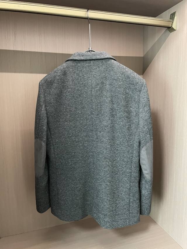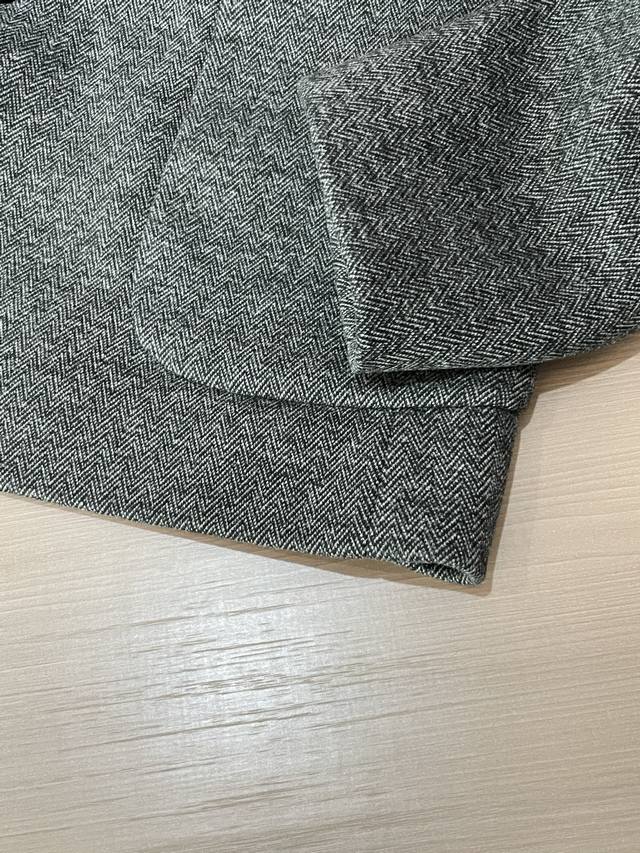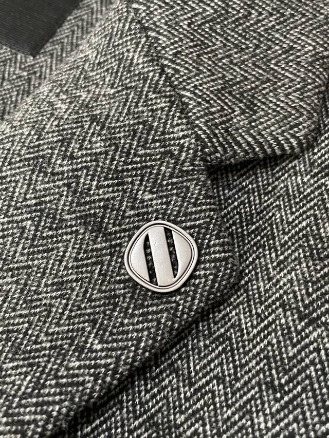 Crafted from fine wool, the light brown herringbone pattern creates a sense of understated luxury, reflecting the light's premium quality. The classic suit silhouette is crisp and sharp, with peaked lapels elevating the look. The functional chest pockets and branded metal buckle details create a sophisticated yet refined look. A must-have for the sophisticated.