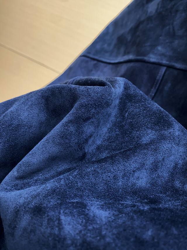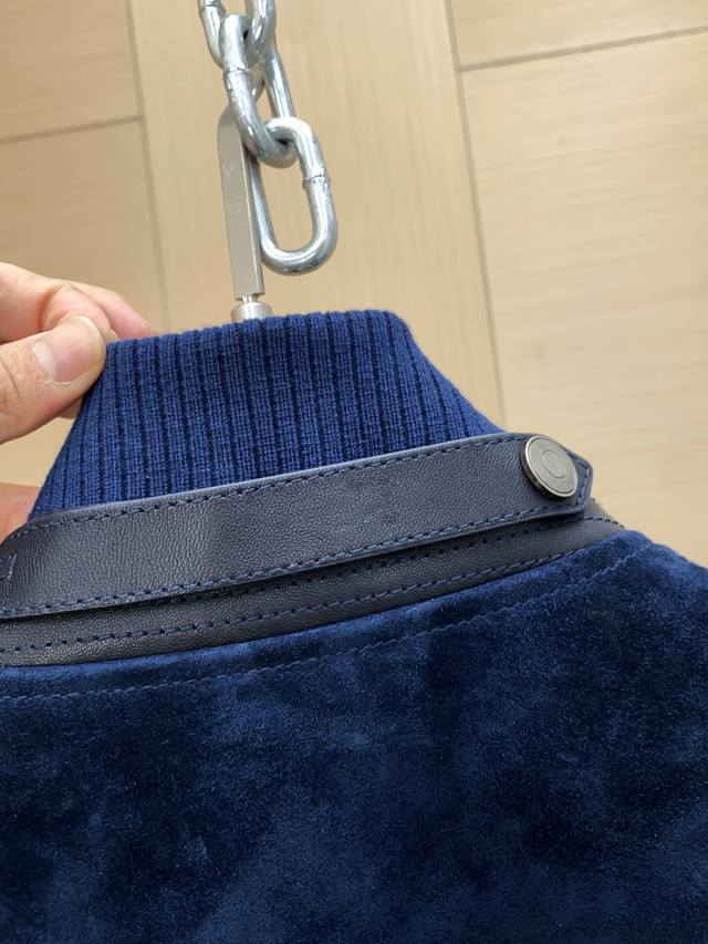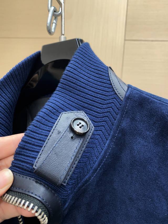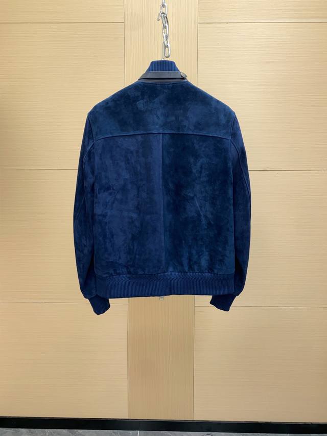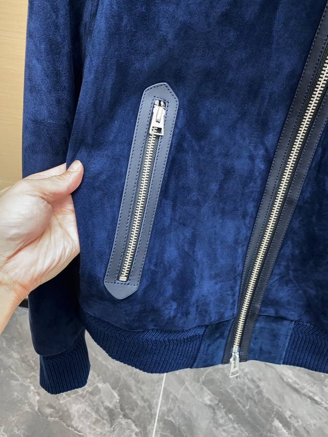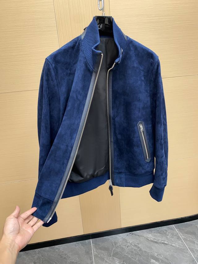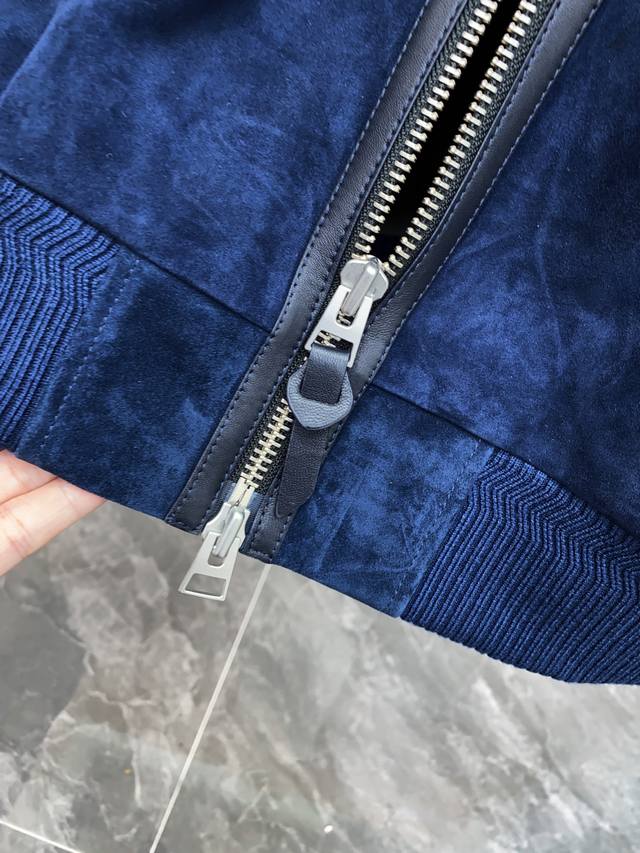 Tom Ford's classic blue stand-up collar bomber jacket is the epitome of vintage pilot style! This jacket is made of 100% Italian lambskin suede, which feels super soft and has a full texture. It is the perfect combination of touch and texture. Size: 48-56