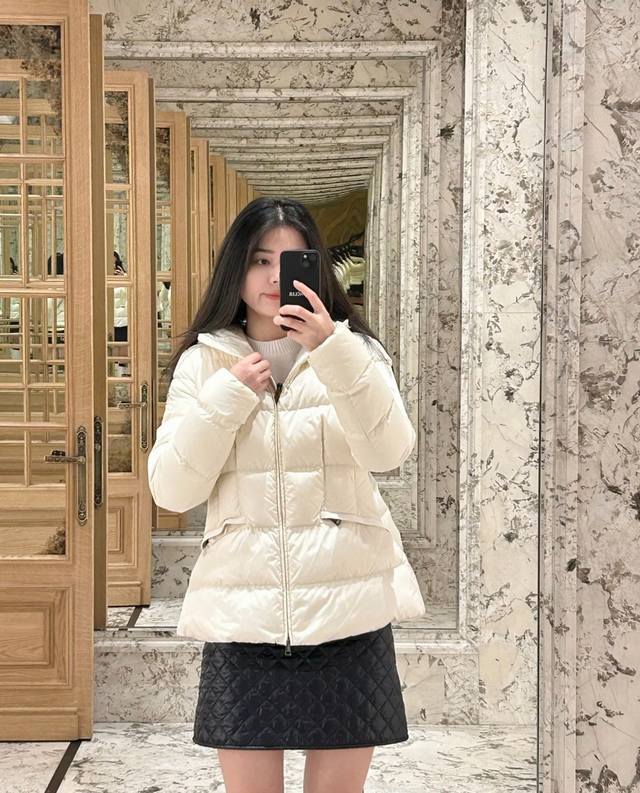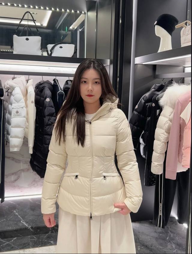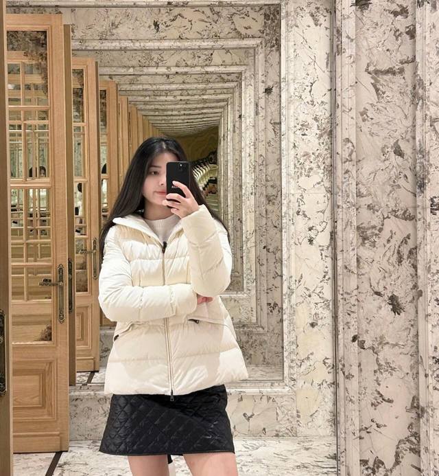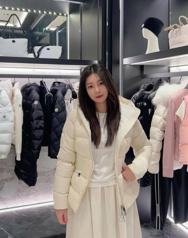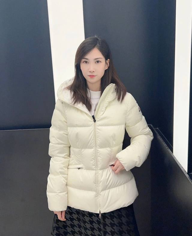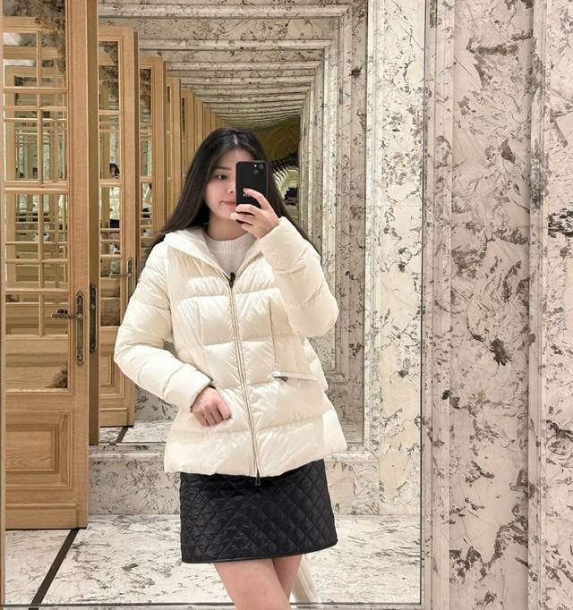 Top-quality export Moner Avoce short down jacket for women. Correct cut and fit, instantly giving you a tiny waist. Made from nylon fabric, the Avoce short down jacket is an everyday design piece from the women's collection. Dynamic and elegant, the Avoce short down jacket embodies the aesthetic style of the Moner women's collection. Functional nylon fabric provides comfort, paired with a lightweight Longue Saison lining, an adjustable hood, and zippered pockets for enhanced practicality. Details: Made from nylon fabric; Longue Saison lining; Down filling; Adjustable hood; Zipper closure; Zippered suit pocket; Elastic waist belt with outline logo buckle; Logo patch; Size: 1-4; Black/Off-white.