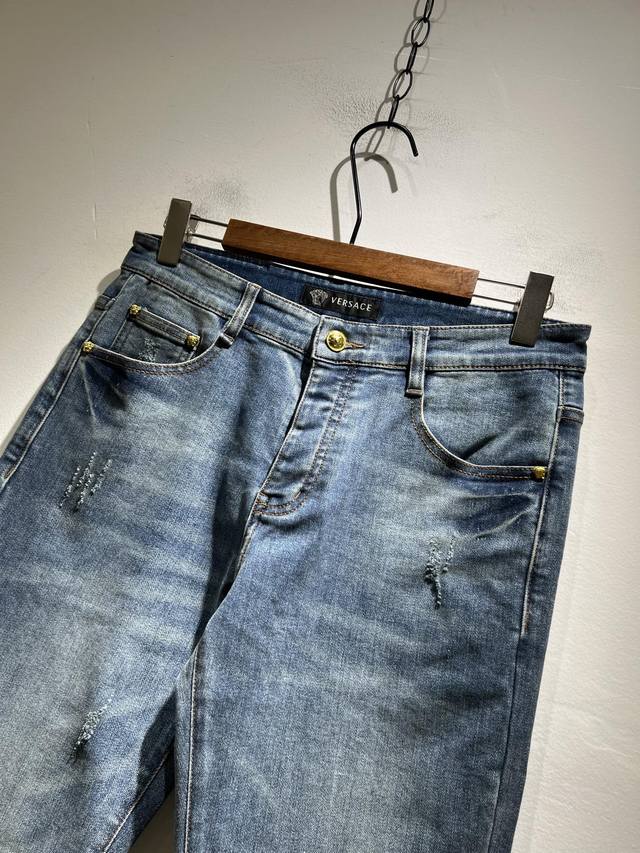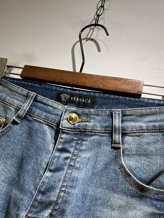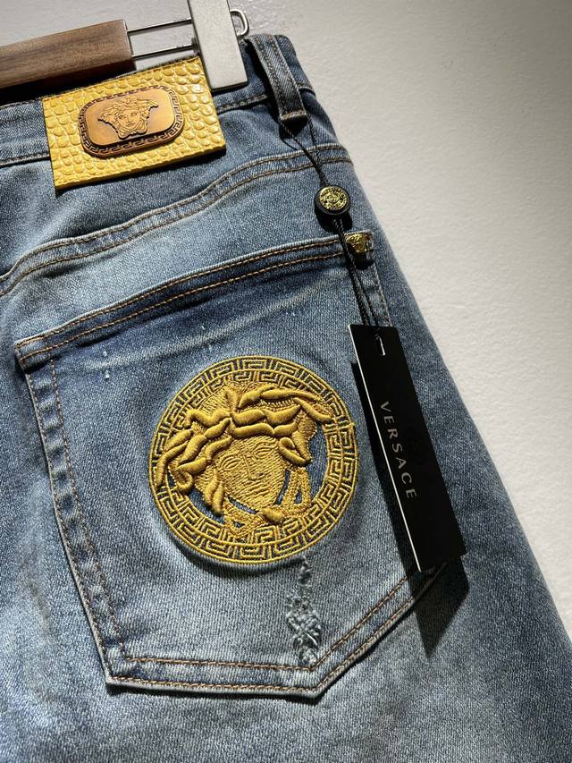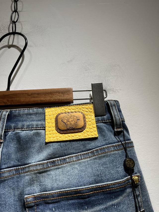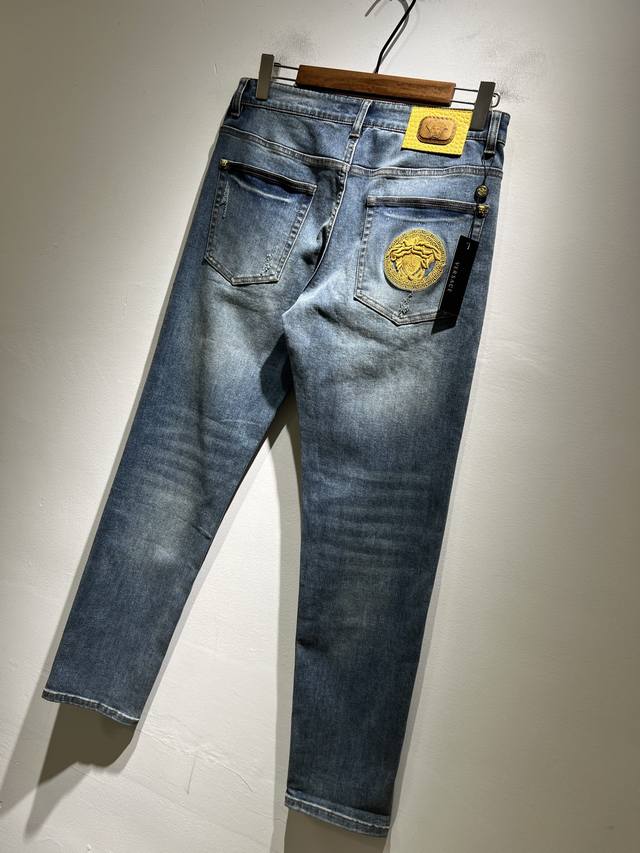 Versa*E Van*Zhe 2025 Spring/Summer new classic men's casual jeans, produced by OEM factory P, exported to Europe and the United States, and sold simultaneously in official counters! Made from custom-made Turkish denim, it's soft and comfortable to wear. The fabric is heavily washed and polished for a more personalized and fashionable look. A Medusa head logo waist badge and brand logo embroidery on the pockets showcase a unique and modern attitude. Highlight the brand's recognition! Perfectly crafted, with a slim, natural fit and a slim fit, these jeans look fantastic on the body. Truly a rare pair of jeans! Sizes: 30-40