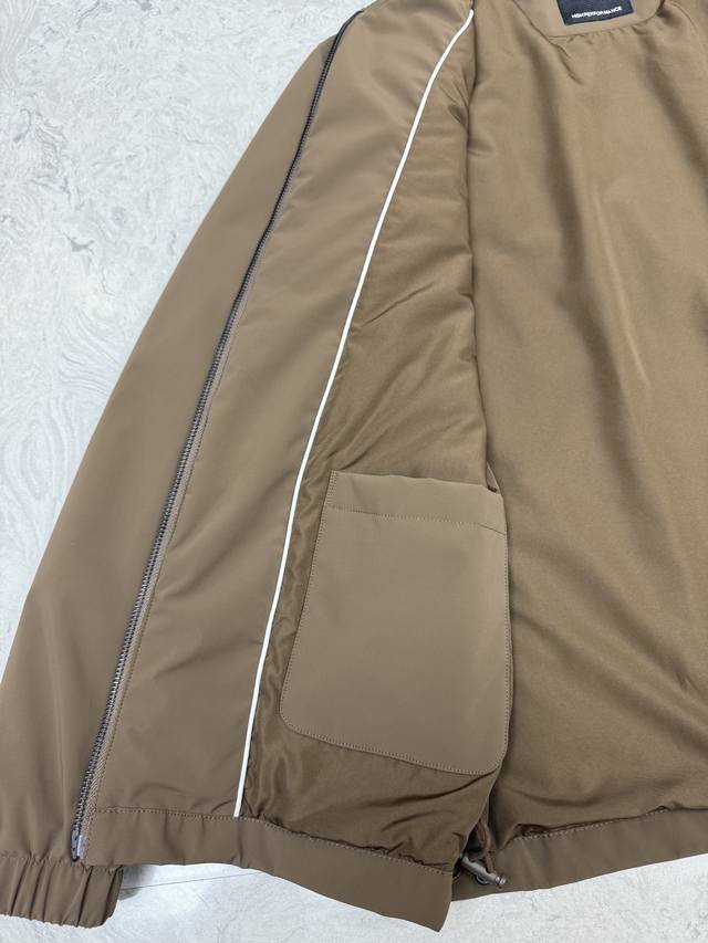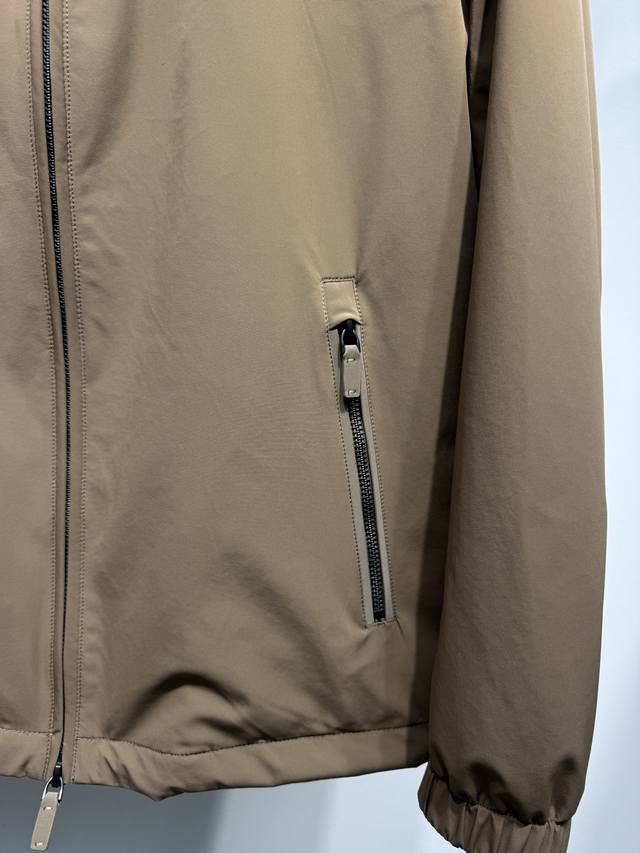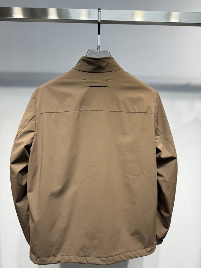 Zegna 2025 New Stand Collar Jacket This Zegna jacket features a casual design with a stand collar and long sleeves that add a touch of sophistication while effectively blocking cold winds around the neck in cooler weather. The streamlined silhouette allows for ample movement, making it suitable for various everyday occasions. Its simple and clean lines facilitate layering and styling, making it versatile for casual wear, light outdoor activities, and more. The jacket features two imported metal zippered pockets on both sides, adding practicality and providing a secure storage space for small items. The zipper pulls are made of imported leather , echoing the overall style and showcasing quality in the details. The brand logo is clearly printed on the inside of the collar, subtly displaying the brand identity, consistent with Zegna's understated yet tasteful design philosophy. Sizes: 48 50 52 54 56 Colors: Black, Brown