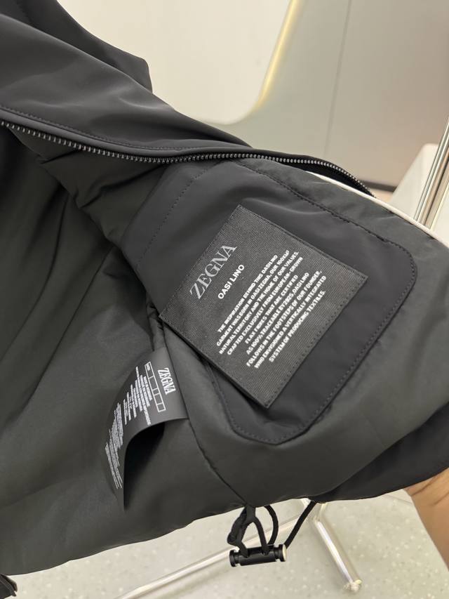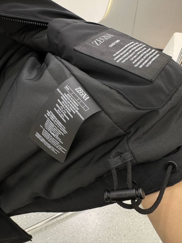 This Zegna jacket features a classic silhouette. The crisp, structured fabric with a subtle sheen creates a premium feel. It's also windproof, perfect for changing weather conditions. Lightweight and easy to care for, it quickly returns to a flat shape when folded, maintaining a sharp look. The signature triangular logo on the chest enhances the brand's distinctive style and adds a touch of style. A zippered chest pocket provides convenient storage for small items, combining aesthetics with practicality.