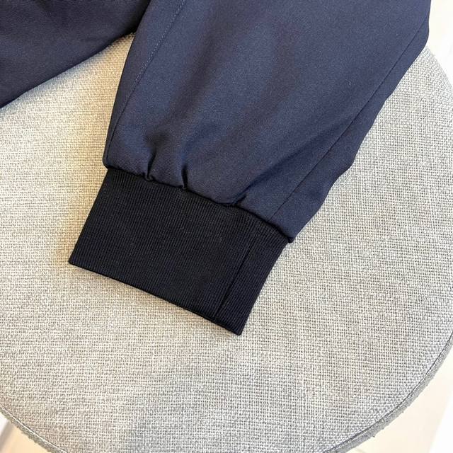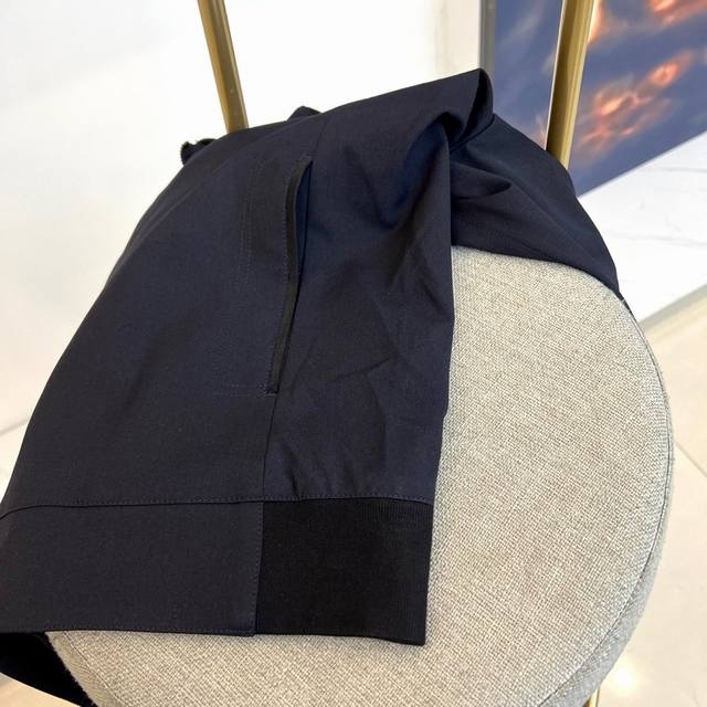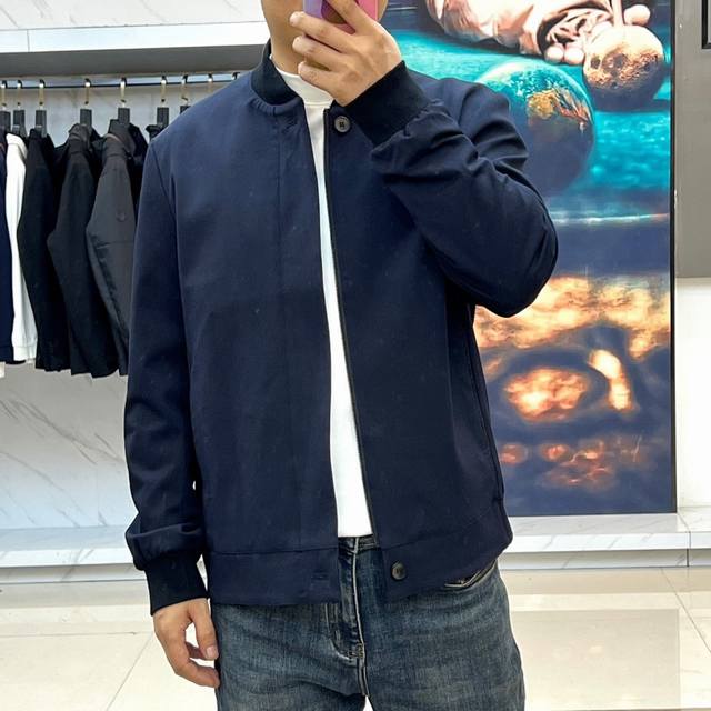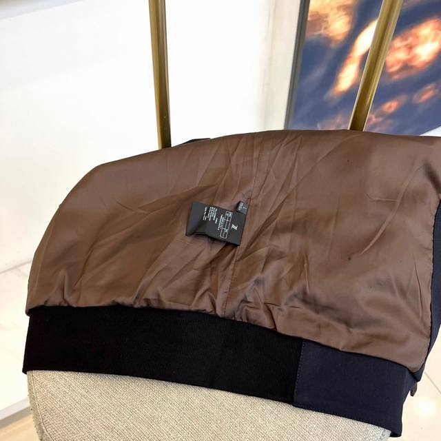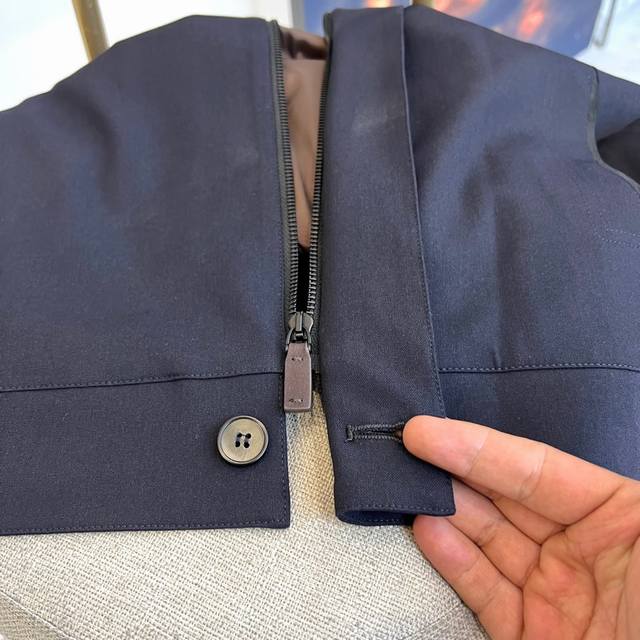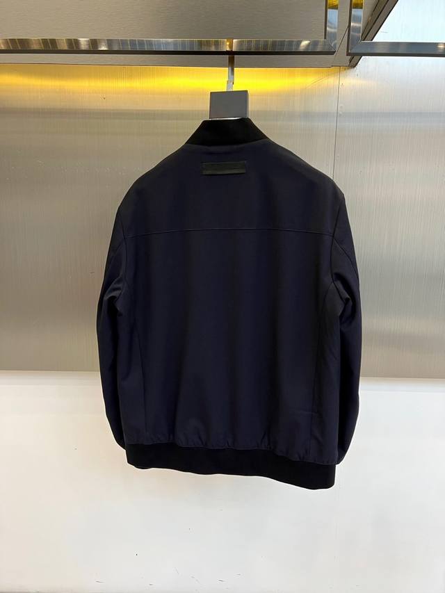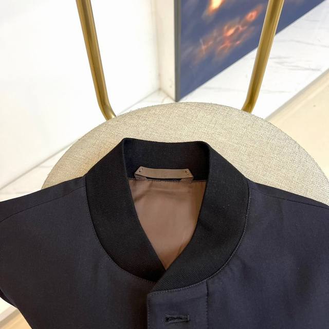 Zegna, Fall/Winter 2025, Men's Business Casual Cashmere and Wool Blend Jacket with a Loose Baseball Collar. Crafted from a dark blue cashmere and wool blend, this jacket offers a refined matte finish and exceptional warmth. The baseball collar features contrasting black trim, while the collar, cuffs, and hem are finished with tonal ribbed knit, creating a sophisticated visual layer. The jacket fastens with two hand-finished matte metal buttons on the front and features the brand's signature square logo embroidered above the left sleeve, highlighting its Italian craftsmanship. The loose fit offers modern comfort and an elegant silhouette, with ample interior space for layering with suiting or knitwear. This jacket perfectly embodies the understated luxury of old money style. The calming dark blue hue and the blended fabric lend it a premium texture. It pairs effortlessly with formal trousers for a business-casual look or casual trousers for a relaxed, urbane, effortless look. This jacket is suitable for a variety of semi-formal occasions, from high-end business meetings to private social gatherings, and can show the wearer's precise grasp of quality and style, reflecting the brand essence of Zegna that combines traditional craftsmanship with modern aesthetics.