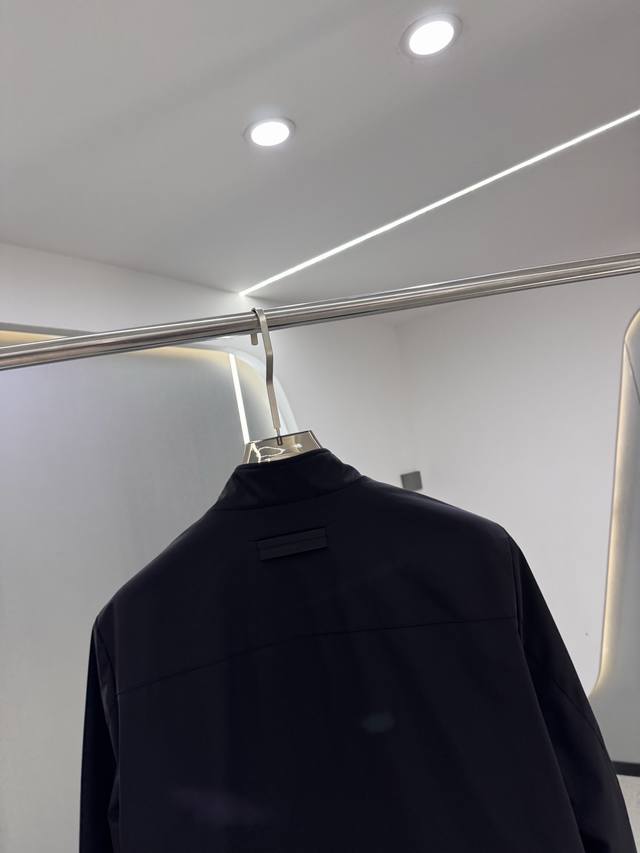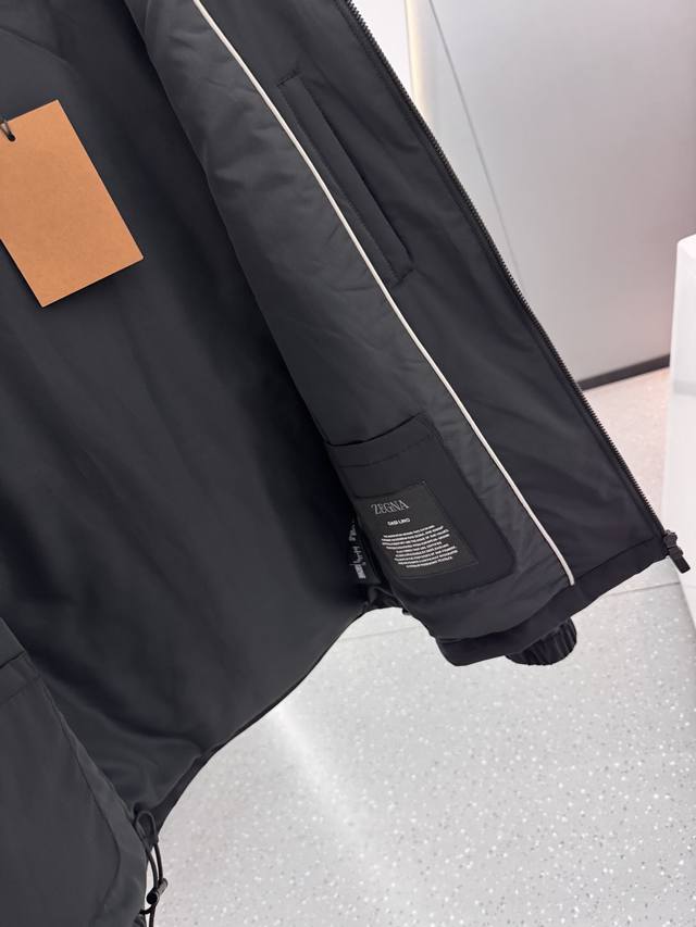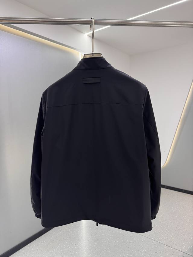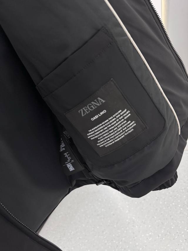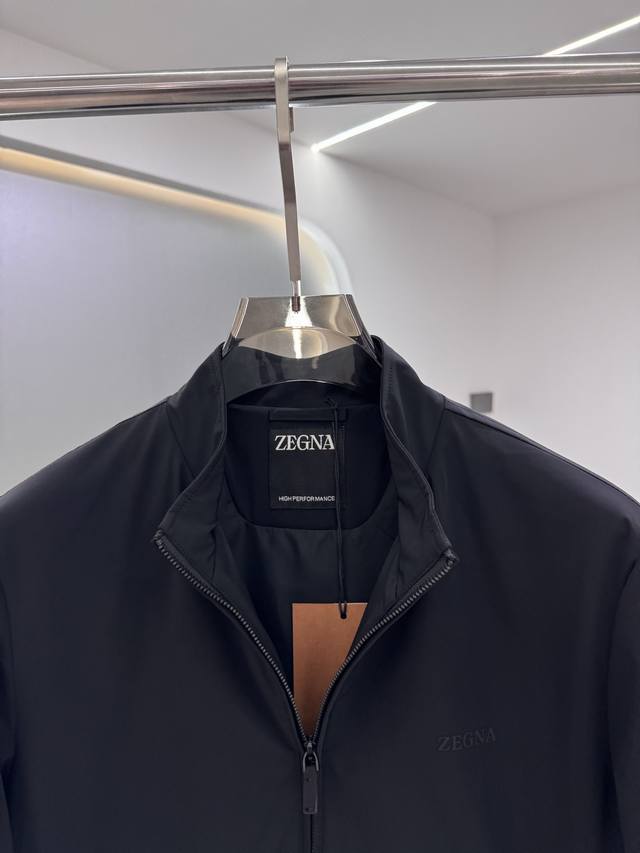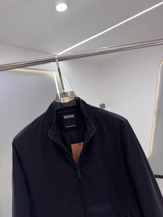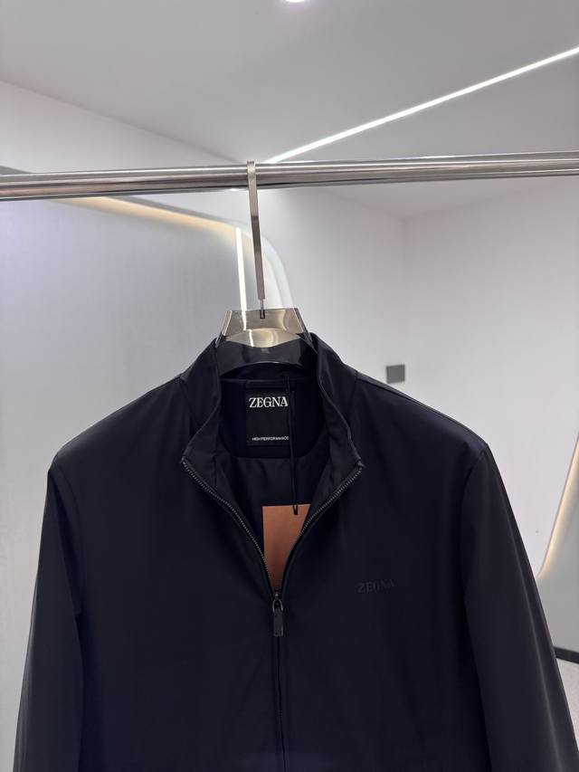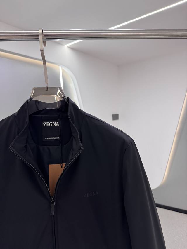This Zegna jacket features a classic silhouette. The fabric is crisp and stylish, with a subtle sheen for a premium feel. It's also windproof, perfect for changing weather conditions. Lightweight and easy to care for, it quickly returns to a flat shape after folding, maintaining a sharp look. The signature triangle logo on the chest enhances the brand's distinctive style and adds a touch of style. A zippered chest pocket provides convenient storage for small items, combining aesthetics with practicality.