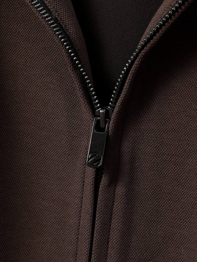 zipper features a premium feel, with "Zegna" printed on the pull tab. The pull tab is made from the same color as the jacket, as seen on the red model, enhancing the overall look. The zipper is smooth and easy to open, and when closed, it fits snugly around the collar, enhancing windproofing. The