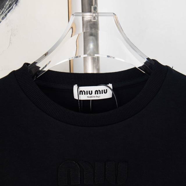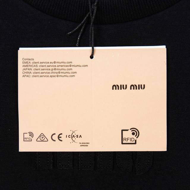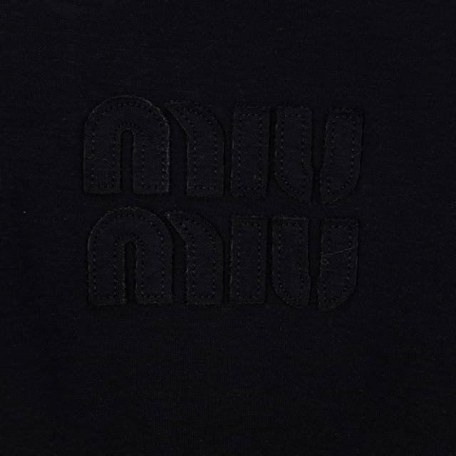 Craftsmanship: The Miumiu fabric label is laser-cut for devouring, laser-positioned, and hand-applied. Computer-positioned, the logo is then embroidered.