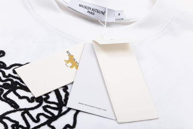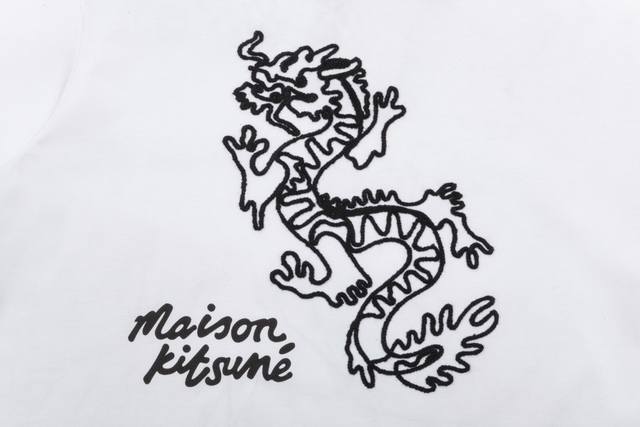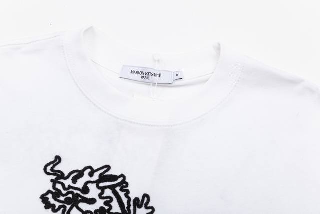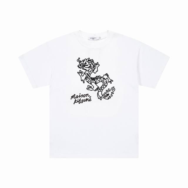 1219# Maison Kitsune Spring/Summer 2024 New Arrival: Wei Daxun and Yang Zi's Same Style Auspicious Dragon 3D Embroidered Print Crew Neck T-Shirt, Unisex. Colors: Black, White, Black, Purple, White. Sizes: S-XL.