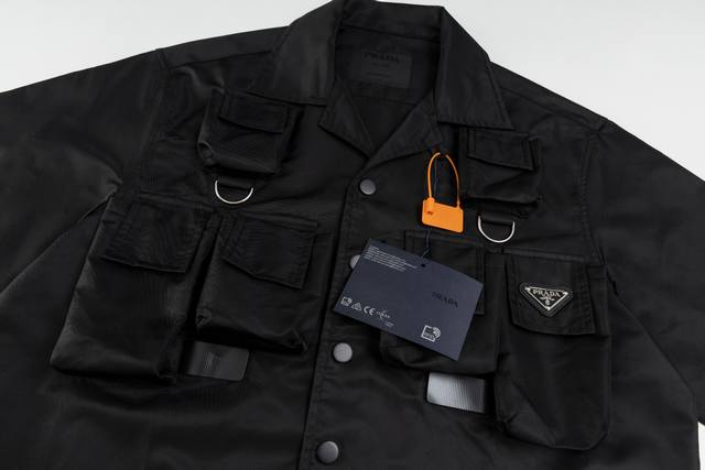 25Ss Multi-pocket Battlefield Functional Short-Sleeve Pra* Made with iconic innovative recycled nylon Re-Nylon, featuring a bowling collar for a practical and modern look. Compact and functional pockets add a touch of sophistication. Oversized fit, bowling collar, flap pockets. Style No.: 6706 Short. Sizes: S, M, L, XL.