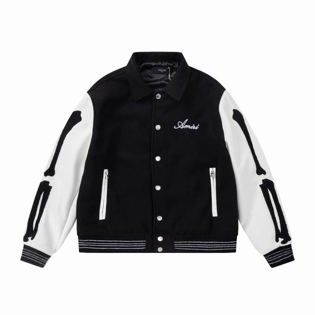 7033# Amiri Autumn/Winter 22Ss Bone Towel Embroidered Jacket, Chanel-Style American Casual Baseball Jacket, Trendy Outerwear for Men. Colors: Black and White, Black and Blue. Sizes: S, M, L, XL,