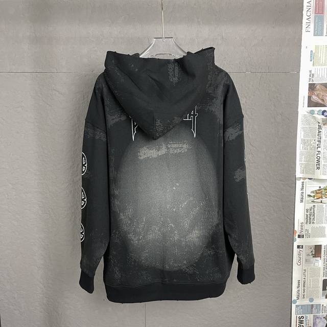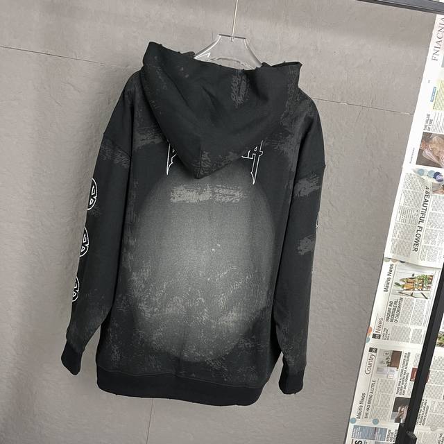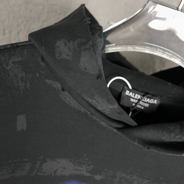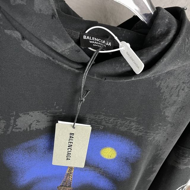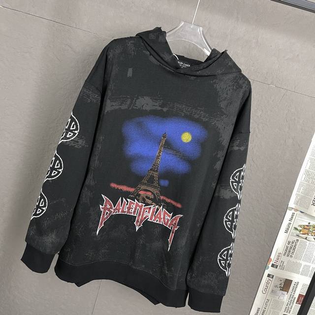 A89 Ddd High Quality - Balenci*Ga Paris Eiffel Tower Hooded Sweatshirt. Purchased directly from the original pattern. The front and back sleeve prints use imported Conley direct-to-garment printing technology. The garment undergoes a second wash, and all details are meticulously hand-positioned, distressed, and frayed for an artistic, distressed effect closer to the original. The distressed effect is achieved through hand-positioning, smoothing, and applying ink/mud by experienced craftsmen for greater precision and time-consuming work. Details are perfectly reproduced. Exclusively custom-woven and dyed 480G ribbed fabric, dyed in the same batch with zero color difference compared to other common items on the market. Unisex style. Ddd - Color: Black Ddd - Size: Xs SML DDD