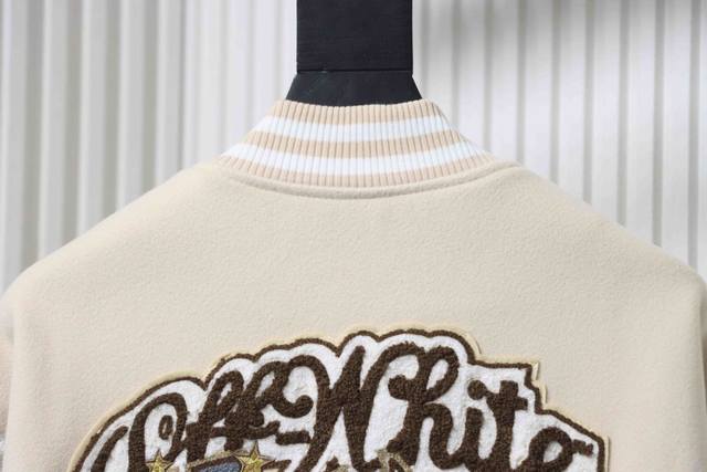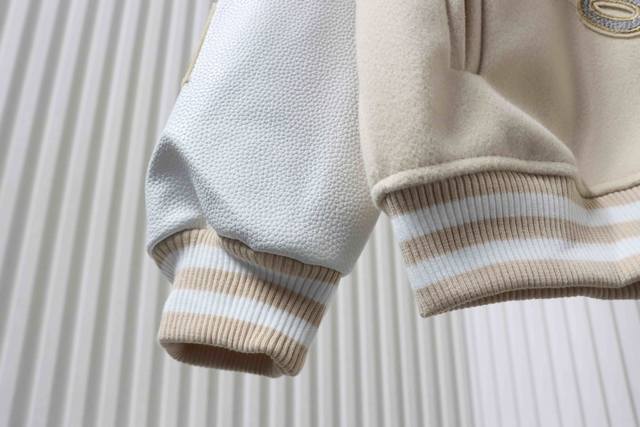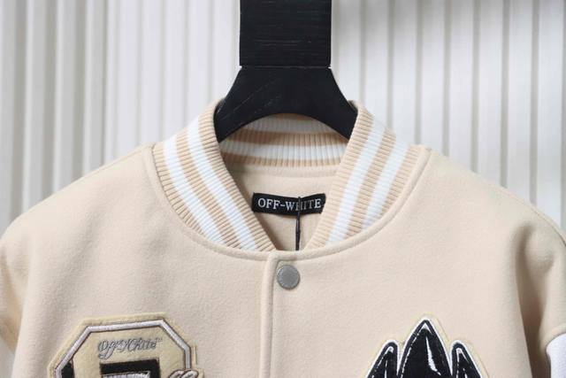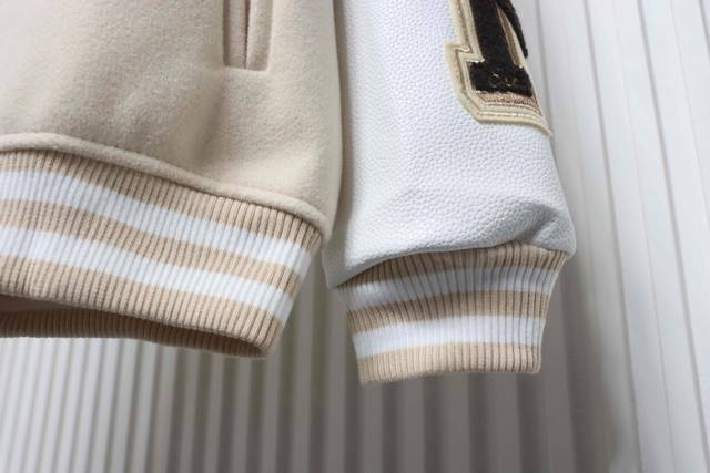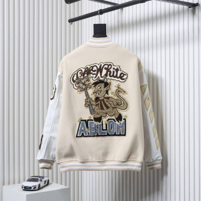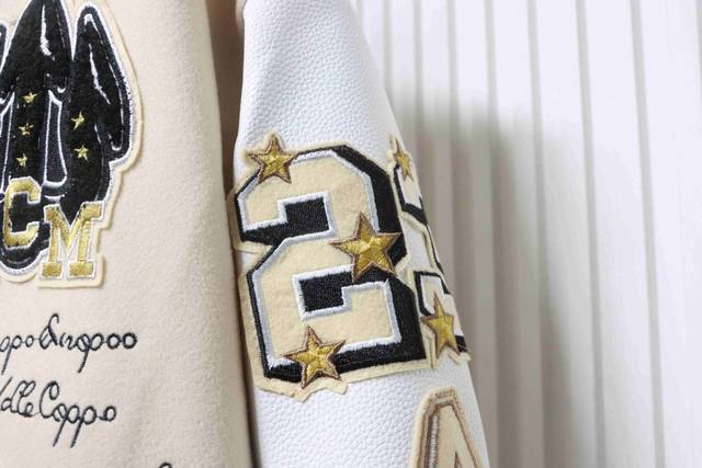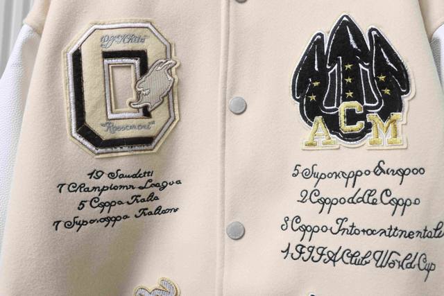 Ac Mlian Xoff White Devil Towel Embroidery Collaboration Baseball Uniform combines a wool body with leather sleeves. Custom-woven and dyed high-elasticity ribbed fabric on a German-imported flat knitting machine, the wool jacquard ribbed fabric is skin-friendly and has a three-dimensional feel, injecting a fashionable trend into the classic silhouette. Made with imported PU leather, the texture is incredibly textured and hand-cut with meticulous craftsmanship. The placement of the patchwork is highly technical; the overall look of the garment depends on this placement. Custom-made accessories and clear, perfect lettering give it a high-end and sophisticated feel. The entire garment is crafted with heavy-duty techniques, exclusively custom-made towel appliqu