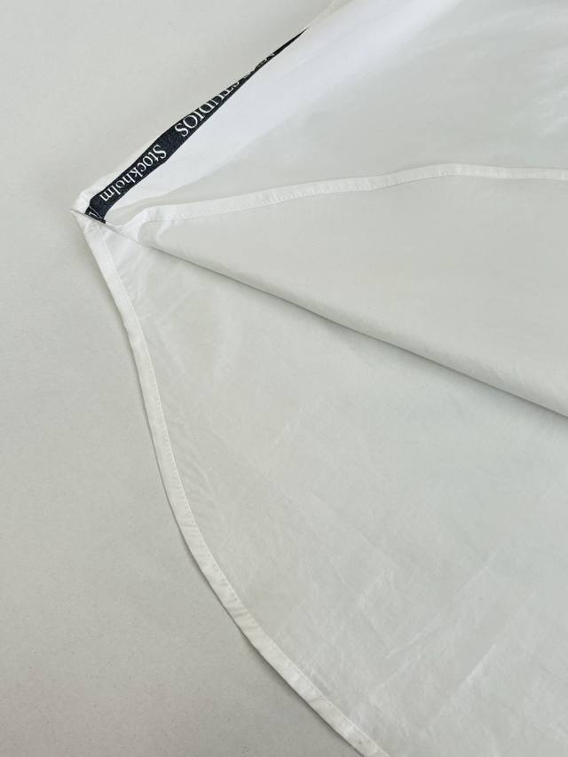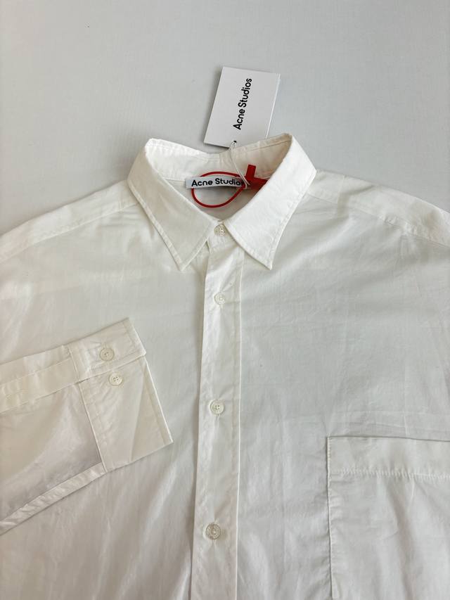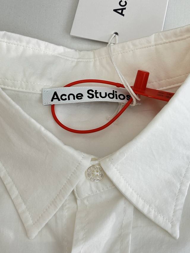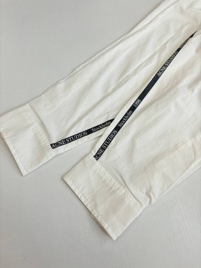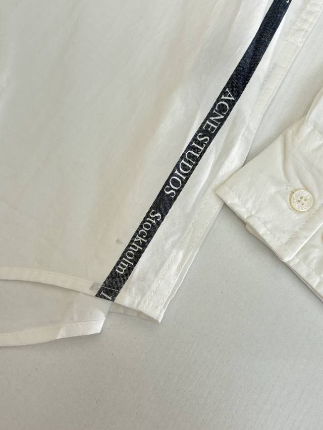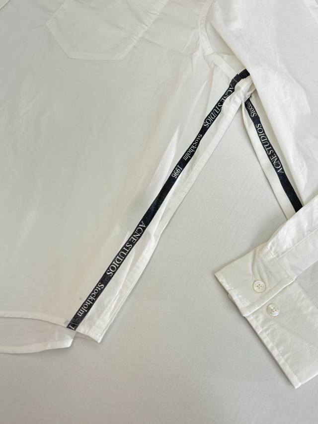 Acne Studio* Jacquard Logo Shirt. Made of custom-finished glossy Tencel cloud satin, this lightweight, flowing, and comfortable shirt features a pure and clean white base. The minimalist aesthetic adheres to a minimalist style, with clean, flowing lines. A subtle jacquard logo stripe on the inner side adds a touch of dynamic brand DNA, exuding luxury and charm with every gesture. Sizes: 44, 46, 48, 50.