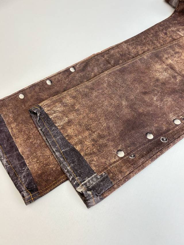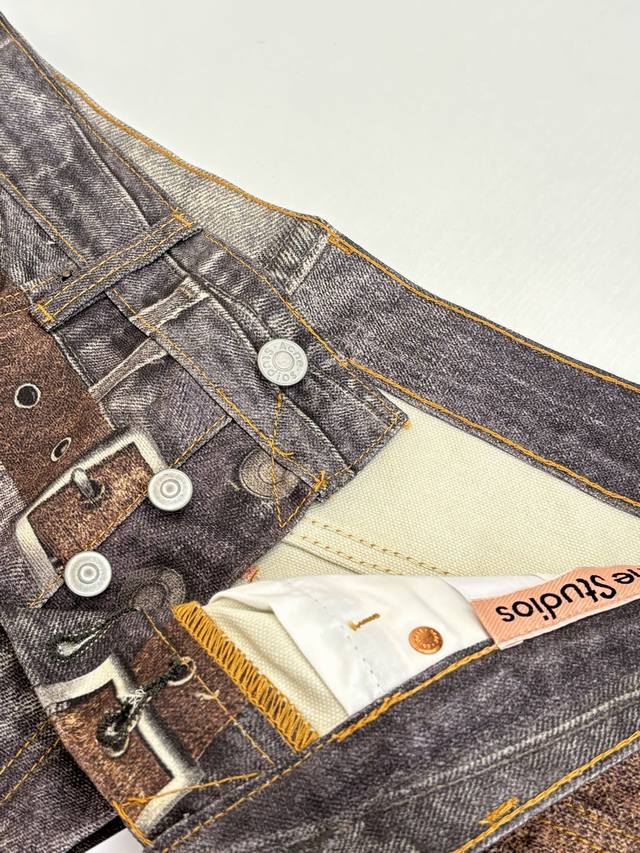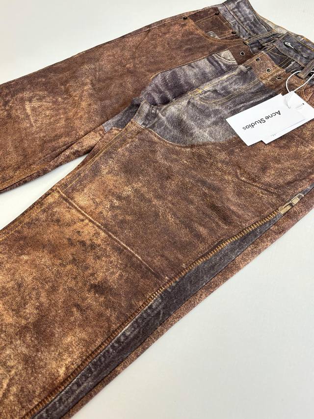 Acne Studio* Optical Print Faux Two-Piece Denim Pants DDD Acne Studios' jeans are crafted from 100% cotton canvas, based on an eco-friendly design philosophy. The brushed finish gives the fabric a delicate texture and a soft, comfortable feel. The classic five-pocket design combines practicality and style. The mid-rise waistband, with button and ring closures, ensures both ease of wear and a fashionable look. The pants have a regular fit with wide, structured legs that subtly flare out from the knee, creating an elegant bell silhouette that gives the wearer a retro yet modern look. The most distinctive feature is the seasonal Trompe-L'Il print, mimicking the three-dimensional effect of leather and adding an artistic touch to the minimalist design. Every detail reflects the brand's dedication to craftsmanship, showcasing the natural beauty of eco-friendly materials while creating a unique fashion style through clever tailoring and printing techniques. DDD Size: 46 48 50 52 DDD