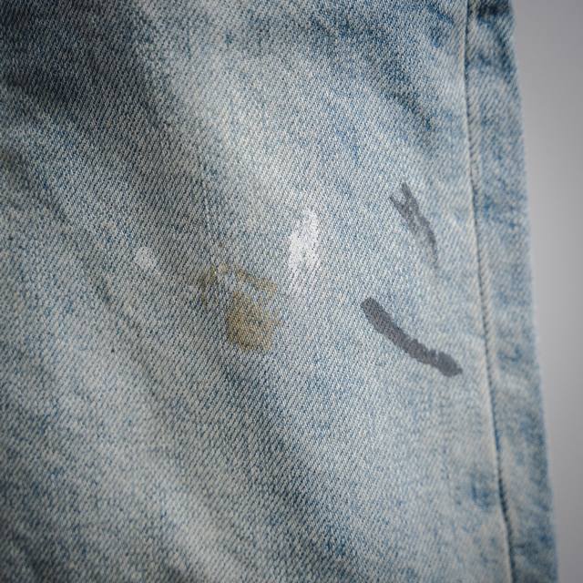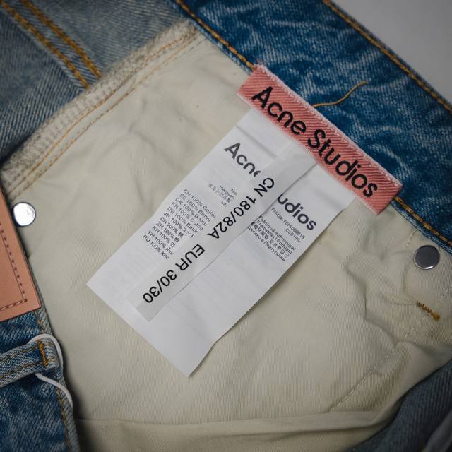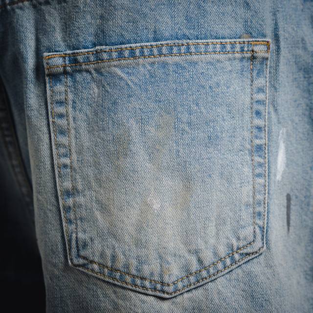 Official website 0, premium model made of black and light blue washed rough denim fabric, five-pocket structure, button placket, washed completely by hand-splashed ink!