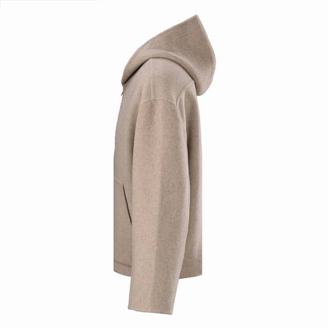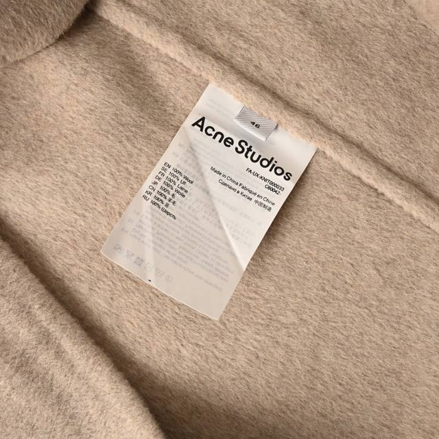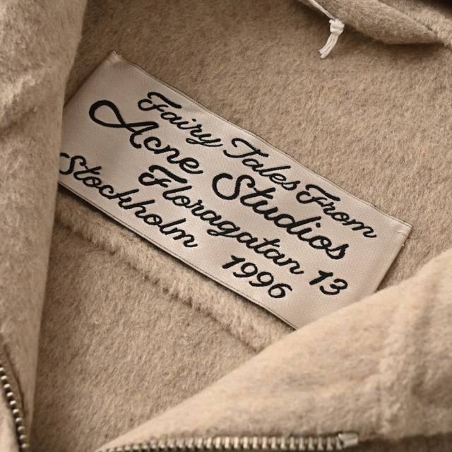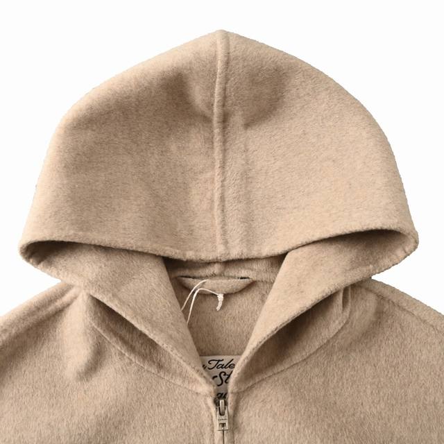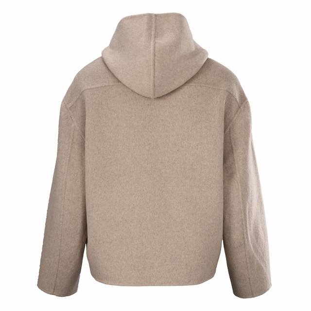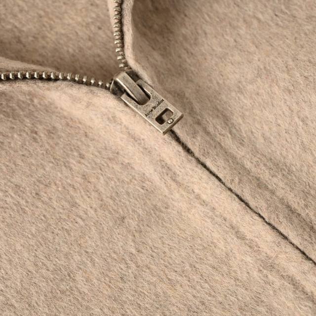 Acne Studios Double-Faced Cashmere Hooded Jacket - Oatmeal. Purchased from Hangzhou Guozhuan for 11,500 yuan, this original custom-dyed yarn is made from a blend of 70% wool, 20% cashmere, and 10% polyester, with a production cycle of approximately 25 days. Custom sleeve lining and custom logo are included, with a 5.5cm drop below the center collar. Four-stitch hand-stitching is performed on each side, along with a custom size 5 metal open-end platinum engraved zipper. This jacket features original craftsmanship using double-faced cashmere. All seams are sewn and hemmed by hand, resulting in a low production volume. One worker can only produce one and a half pieces a day. This unisex style features a loose fit and excellent craftsmanship. Size: 464850.