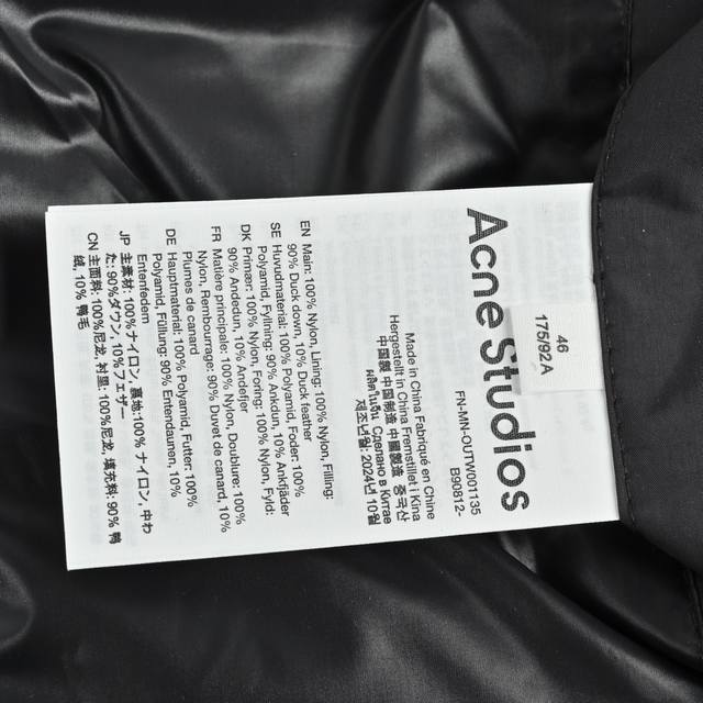 Acne Studios Ddd Small Label Down Vest. Made with high-count, high-density woven fabric, "high-count" refers to extremely fine yarns, giving the fabric a delicate, soft touch and a premium feel; "high-density" refers to an extremely high number of warp and weft threads per unit area, fundamentally forming a strong physical barrier against cold winds and effectively preventing the inner down from escaping. Coating treatment: An advanced water-repellent coating is applied to the dense fabric base. This coating causes water droplets to bead up on the fabric surface and roll off, rather than immediately penetrating. This invisible shield allows the garment to easily handle everyday light rain, snow, and accidental splashes, ensuring the inside remains dry and comfortable. The bonding process between the coating and the fabric requires extremely high precision, ensuring durable waterproof performance without compromising the fabric's original breathability and feel! The core filling of the Ddd vest is 60g of 90% pure white duck down certified by the Guangzhou Institute of Fiber Products Testing and Research, a national authoritative institution. This certification is irrefutable proof of quality, emphasizing authenticity. The 90% pure white duck down clusters are the core of the down jacket, resembling a dandelion