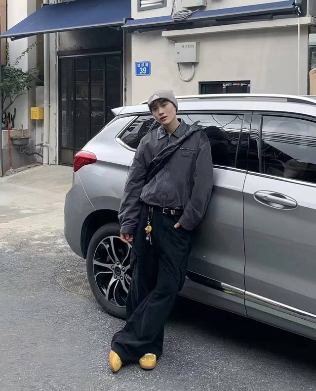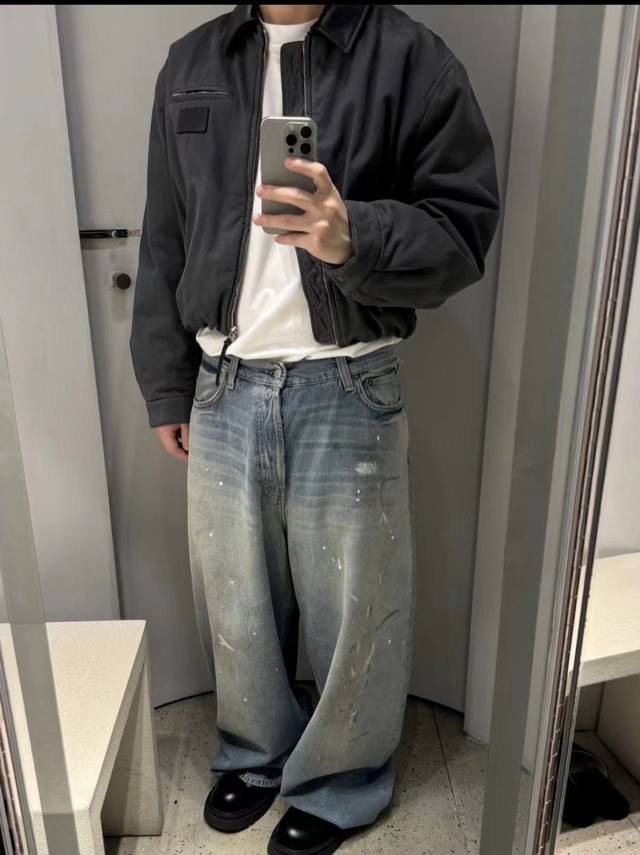 Acne Studios Ss25 Barn-style leather collar logo drop shoulder long-sleeved bomber jacket, unisex. Original purchase, custom-developed fabric, washed and distressed vintage finish. Short cut flatters the legs, vintage gray tone gives it a vintage feel. Pants are wide straight leg, the jacket is slightly longer for more everyday wear! Color: Dark Gray. Sizes: S, M, L, XL. 176cm/150cm wears M (loose fit). Length...