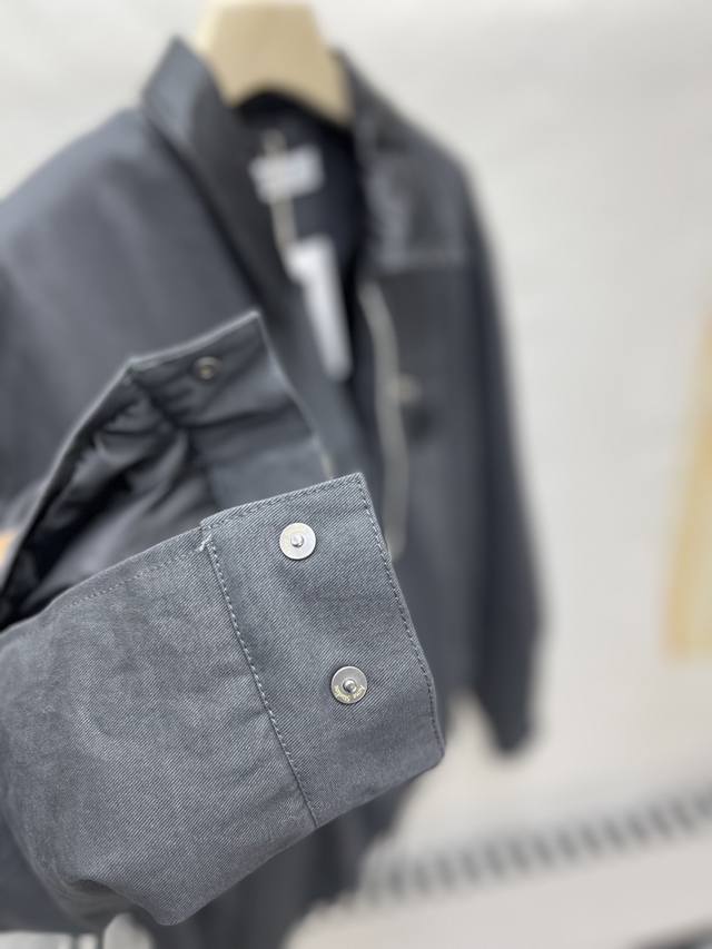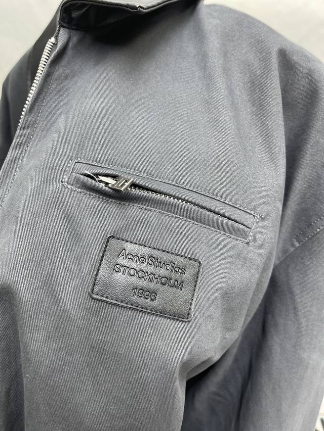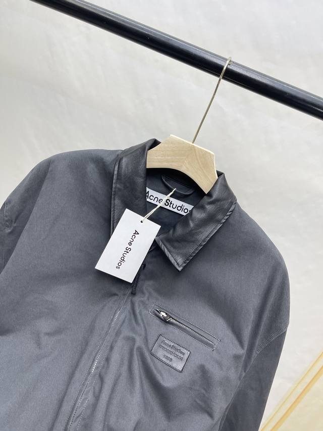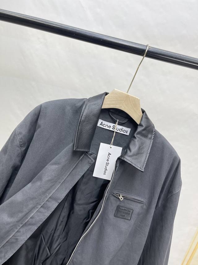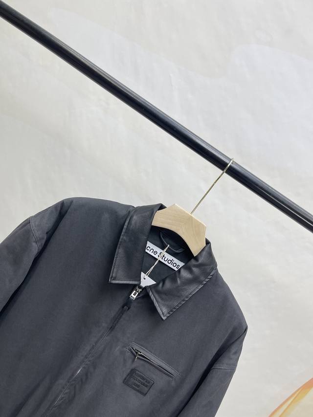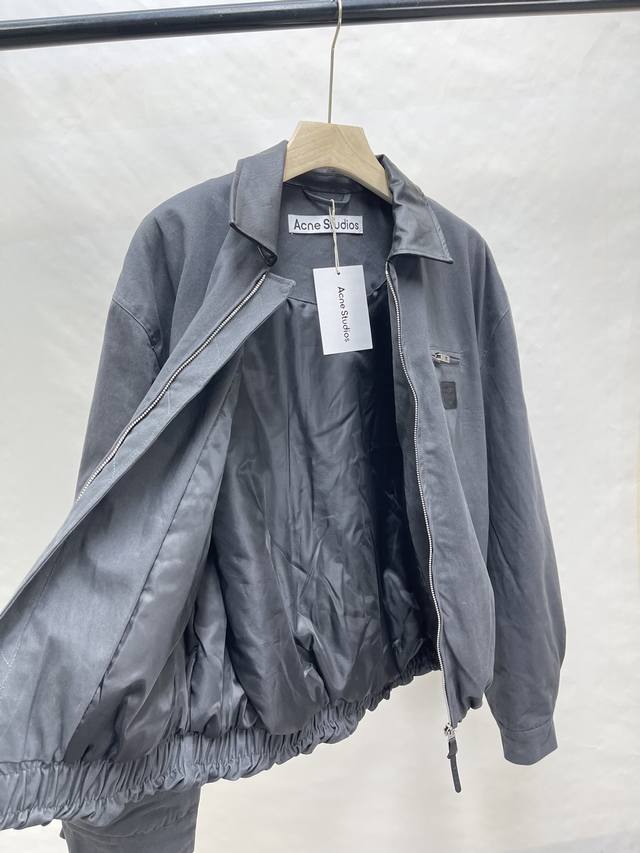 Acne Studios Ss25 Barn-style leather collar logo drop shoulder long-sleeved bomber jacket, unisex. Original purchase, custom-developed fabric, washed and distressed vintage finish. Short cut flatters the legs, vintage gray tone gives it a vintage feel. Pants are wide straight leg, the jacket is slightly longer for more everyday wear! Color: Dark Gray. Sizes: S, M, L, XL. 176cm/150cm wears M (loose fit). Length...
