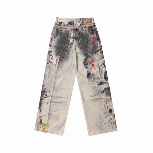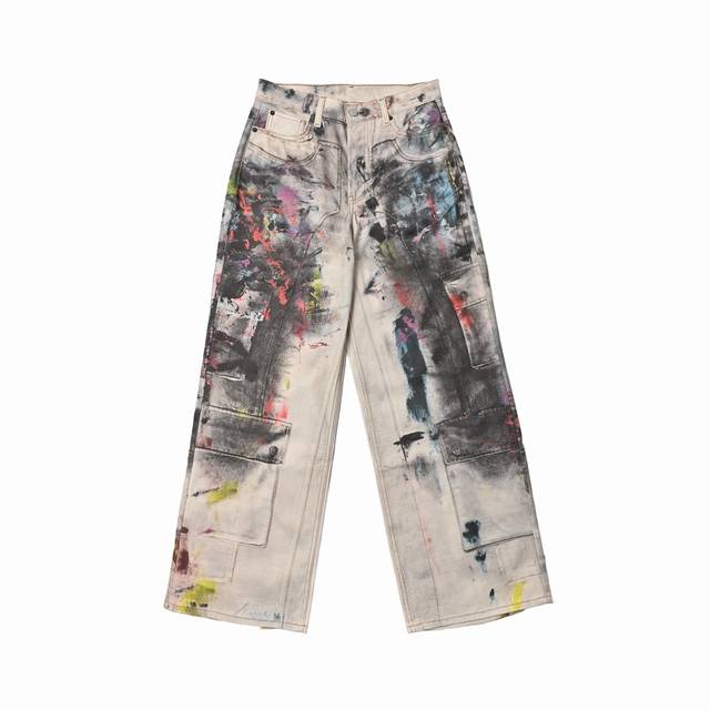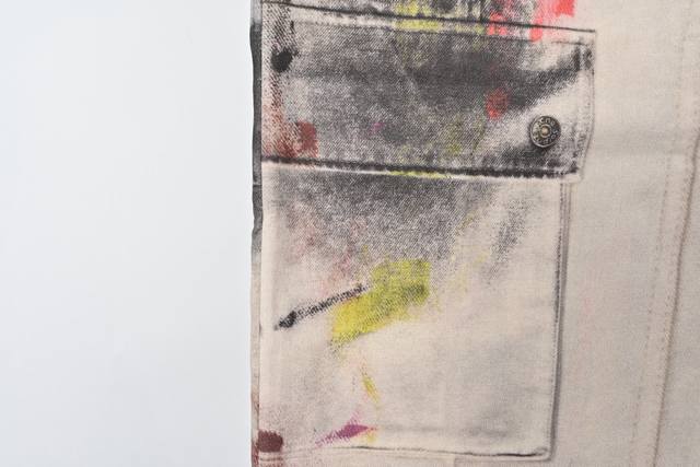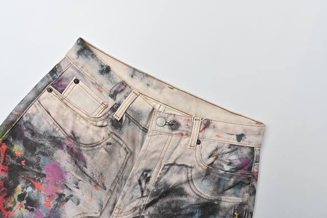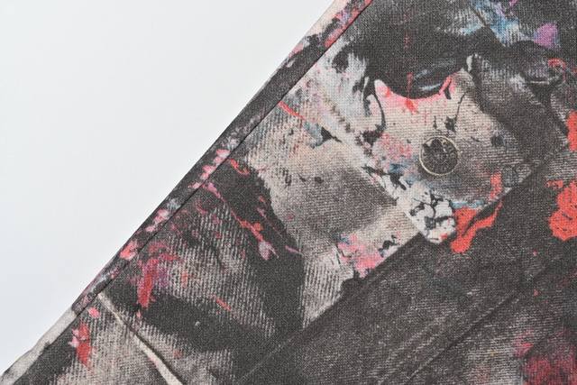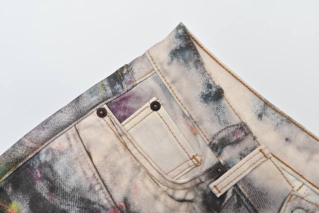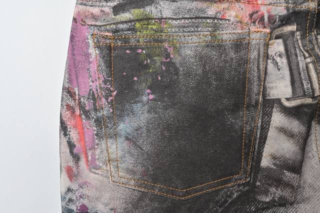 was originally purchased for 6,500. It uses fine cotton twill fabric with a white background on the surface. The ink splashes are all printed through 3D digital direct printing. The printing uses Conley digital piece printing direct printing. The color transition is very delicate and natural. The overall effect is three-dimensional and high-definition, and the visual effect is real enough. The piece of cloth is positioned and printed, so that each piece of flower position is accurately matched with the original. The piece of cloth uses a fully automatic laser burning process with zero error, which is more accurate than manual work. The three-standard auxiliary materials are in line with the original. The design of the straight-leg slightly expanded jeans focuses on comfort and freedom. The loose cut is straight and stylish. The fabric thickness is moderate, and it is not stuffy when worn in summer. The texture of the 3D printing is high-end and fashionable, and it is a work of art that cannot be copied.