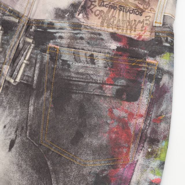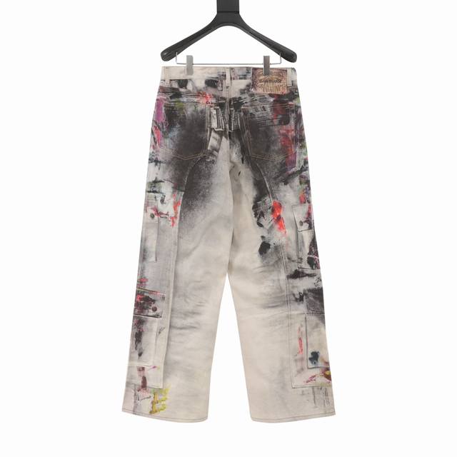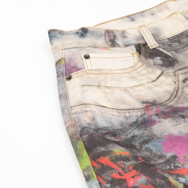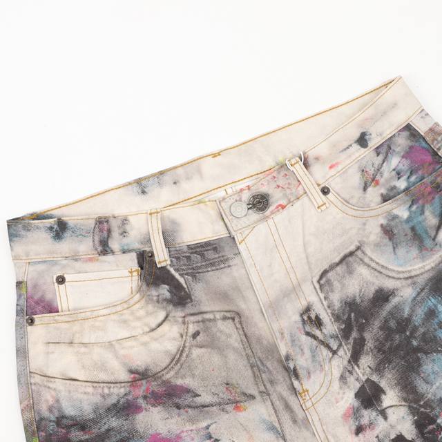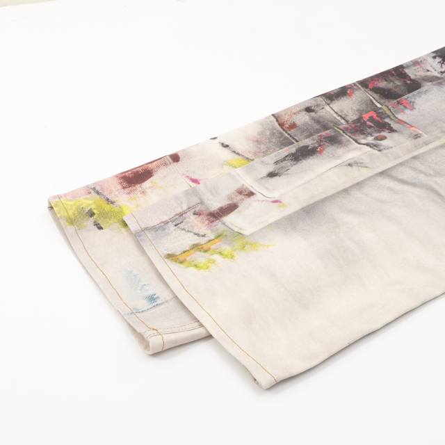 , originally purchased for 6,500, are made of fine cotton twill with a white base. The ink-splashed prints are created using 3D digital direct printing. The prints are printed using Conley digital direct printing, resulting in incredibly smooth and natural color transitions. The overall effect is three-dimensional and high-definition, creating a truly realistic visual experience. The printed pieces are positioned on the fabric, ensuring that each pattern is precisely aligned with the original. The pieces are printed using a fully automated laser burnout process, achieving zero error and greater precision than manual labor. The three-standard trims are true to the original. The straight-leg, slightly flared jeans are designed for comfort and freedom of movement. The loose fit is straight and stylish, and the fabric is just the right thickness for a comfortable summer wear. The 3D prints create a sophisticated and stylish texture, a truly unique work of art.