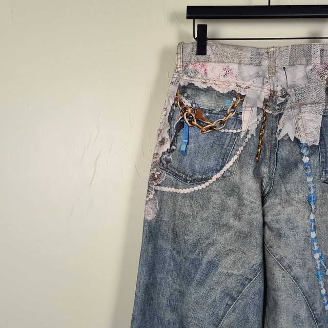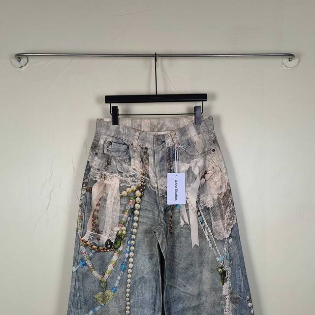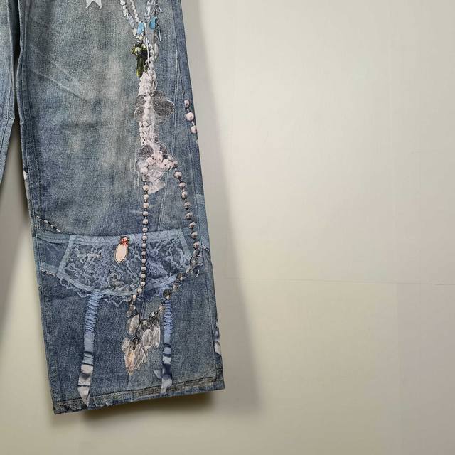 25Fall 1981 Series Lace Pearl Necklace 3D Digital Direct Printing Loose Low-Rise Wide-Leg Jeans
