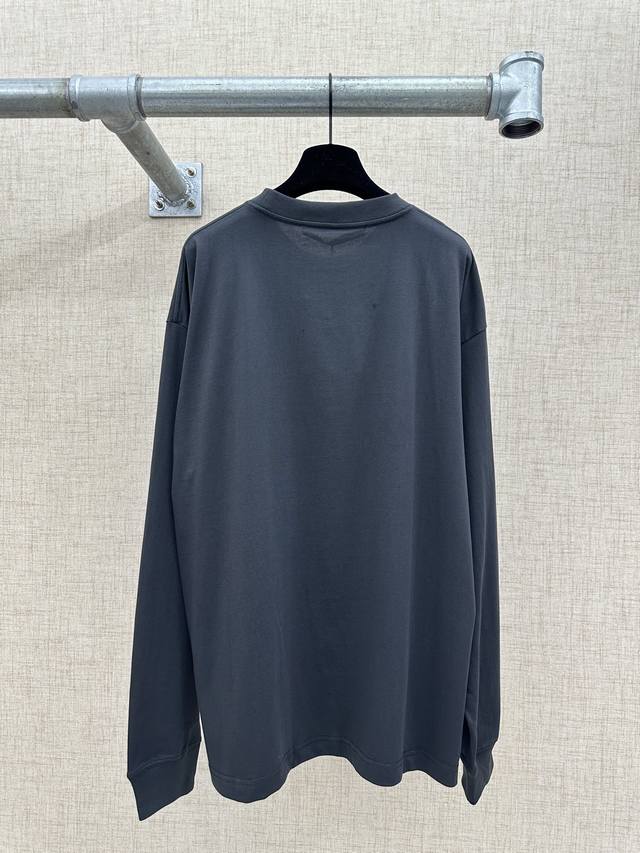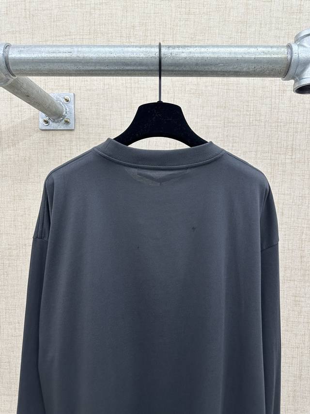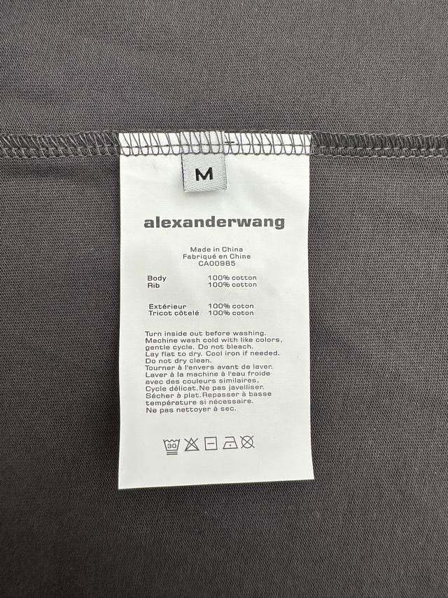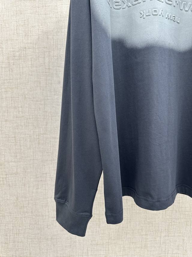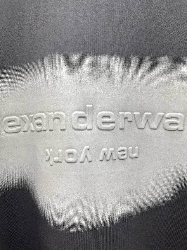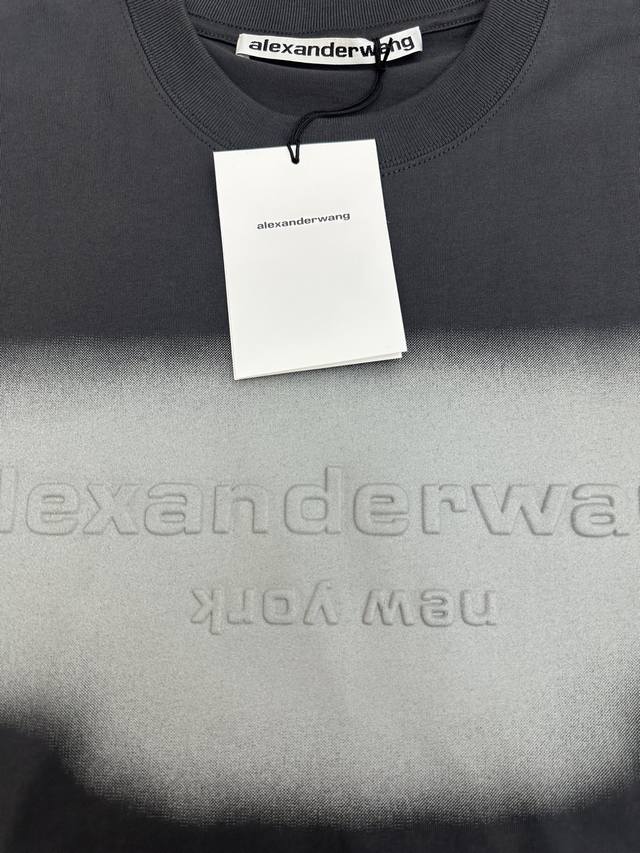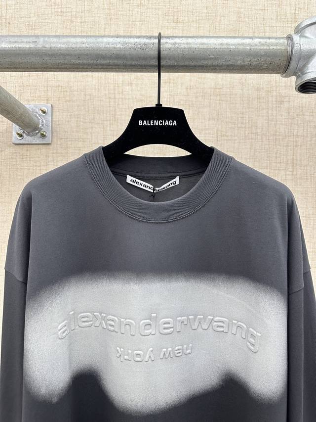 Alexanderwang Unisex Oversized Gradient Embossed Long-Sleeve T-Shirt (DDD) 2026 Spring/Summer Collection. This new long-sleeve T-shirt features an overall charcoal gray tone with a gradient visual area on the chest, paired with an embossed brand logo and the word "New York." The logo uses a reverse embossing technique to add depth. It has an oversized fit, dropped shoulders, and long sleeves, with a loose and flowing silhouette. The back is unadorned, offering a simple yet street-style look. The neckline is a basic round neck with neat ribbed trim. The hem and cuffs are finished in the same material. The fabric is 100% pure cotton knit. This is a long-sleeve version from the Alexanderwang Halo series, maintaining the same design language as the short-sleeve version, emphasizing a street-style, light luxury look with "gradient embossing + loose silhouette." Sizes: S, M, D