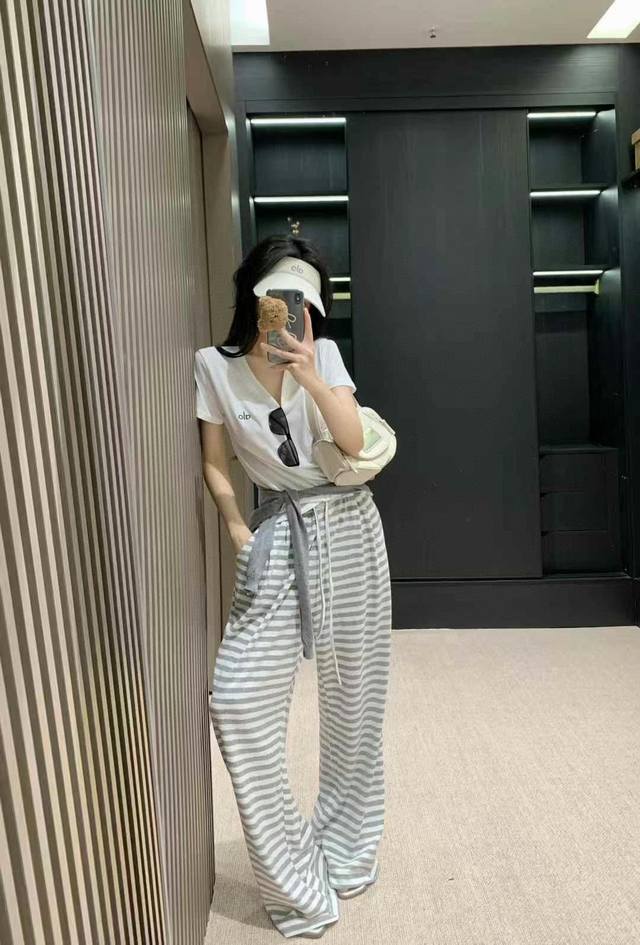 Alo letter embroidered V-neck short-sleeved T-shirt gray shawl drawstring elastic waist striped pants trousers three-piece suit