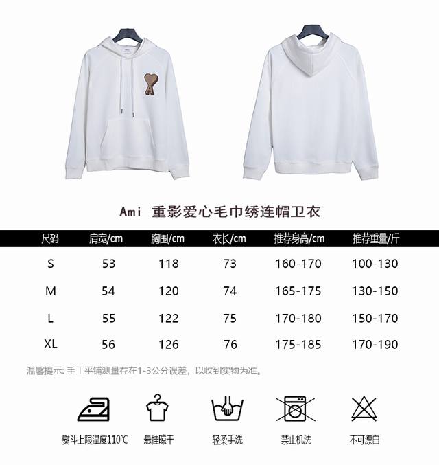 Ami Double-Edged Heart Towel Embroidery Hooded Sweatshirt Ddd Let's skip all the fancy sales pitches and get straight to the product parameters: Ddd 380G custom rough-feel fabric Ddd Correctly dyed in the same color with the correct 2-hole bell-shaped hood drawstring weight 800G high-density pure cotton. The hood drawstrings on the market are only around 200G. A key detail of a high-quality sweatshirt is the hood drawstring, which distinguishes it from low-quality products on the market. Ddd The ribbed fabric uses 500G high-weight pure cotton, woven and dyed in the same batch and color, with no color difference from the fabric. It is not easily deformed after machine washing or water washing. Ddd The embroidery uses the correct 3D towel embroidery shape, which distinguishes it from the flat embroidery version on the market. Ddd The webbing uses high-density, high-thickness V-shaped webbing, which matches the official website. Ddd The hangtag hangs on the side with the correct version from the official website (2025 version). There are two care labels, which distinguish it from the incorrect versions with 3 or 4 labels on the market. Ddd The pattern follows the official website. It can be listed on global shopping platforms without any problems. Ddd Correct 12C high-weight packaging. Ddd Size: S-XL DDD Ddd
