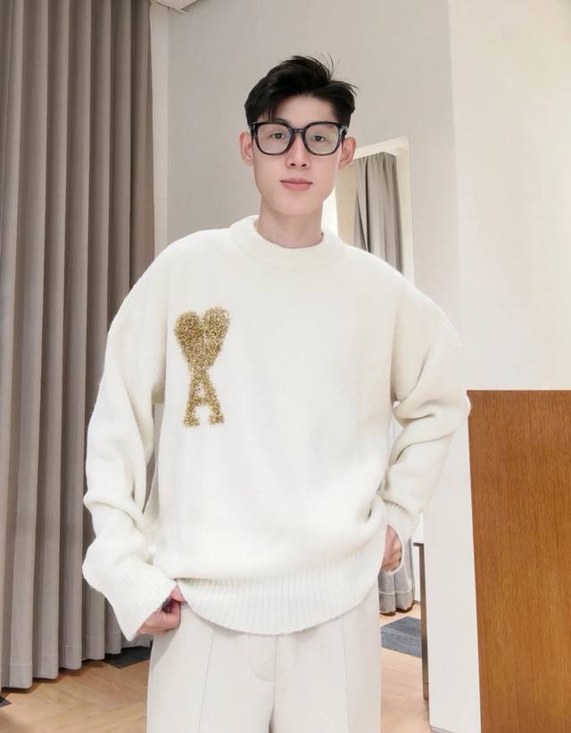 Ami Paris 24Fw Christmas Limited Edition Gold Thread Heart Logo Jacquard Couple Knit Crew Neck Sweater - Top Original Version