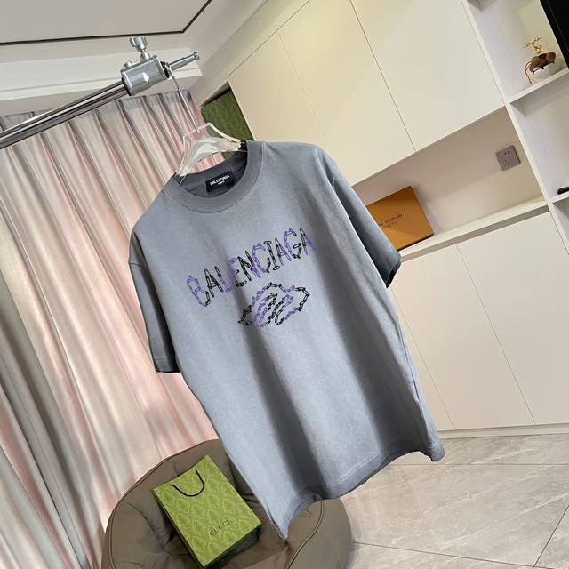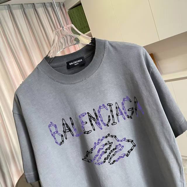 Balenci*Ga Paris 2025 Autumn/Winter New Washed Distressed Ripped Personalized Letter Logo Print Custom Fabric 320G Short Sleeve T-Shirt Unisex Sizes: SML XL Colors: White, Brown, Purple, Gray