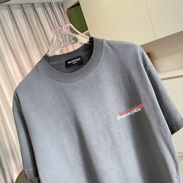 Balenci*Ga Paris 2025 Autumn/Winter New Washed Distressed Ripped Personalized Letter Logo Print Custom Fabric 320G Short Sleeve T-Shirt Unisex Sizes: SML XL Colors: White, Brown, Purple, Gray