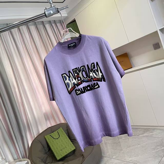 Balenci*Ga Paris 2025 Autumn/Winter New Washed Distressed Ripped Personalized Letter Logo Print Custom Fabric 320G Short Sleeve T-Shirt Unisex Sizes: SML XL Colors: White, Brown, Purple, Gray