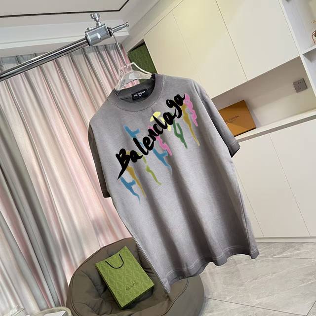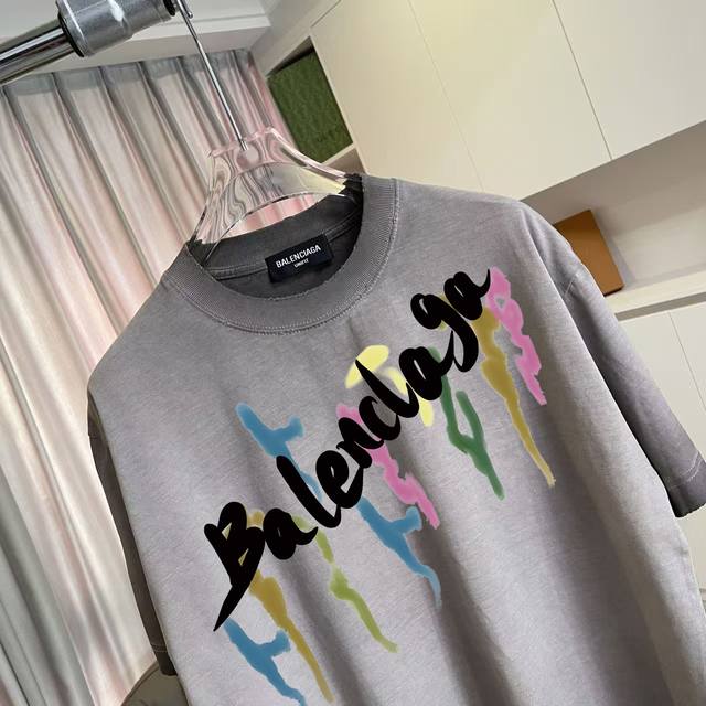 Balenci*Ga Paris 2025 Autumn/Winter New Washed Distressed Ripped Personalized Letter Logo Print Custom Fabric 320G Short Sleeve T-Shirt Unisex Sizes: SML XL Colors: White, Brown, Purple, Gray