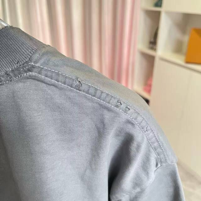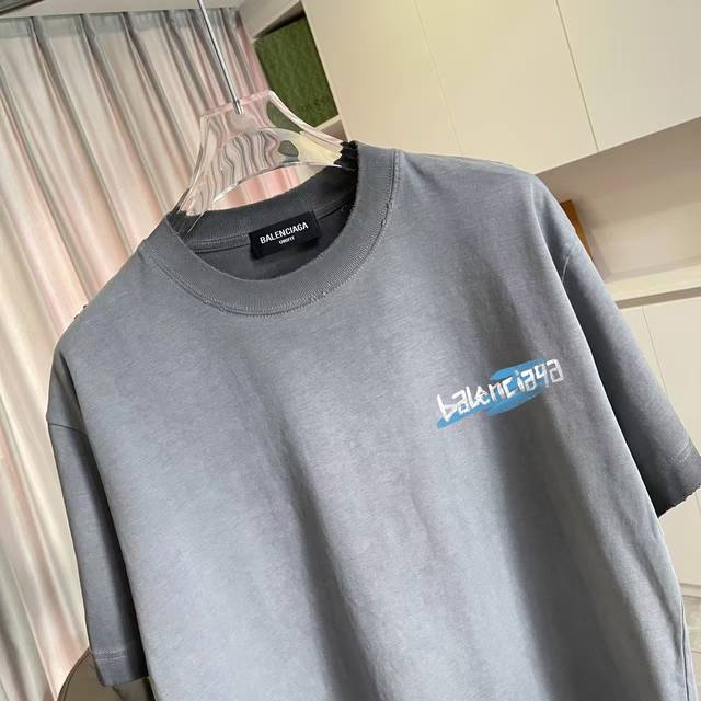 Balenci*Ga Paris 2025 Autumn/Winter New Washed Distressed Ripped Personalized Letter Logo Print Custom Fabric 320G Short Sleeve T-Shirt Unisex Sizes: SML XL Colors: White, Brown, Purple, Gray