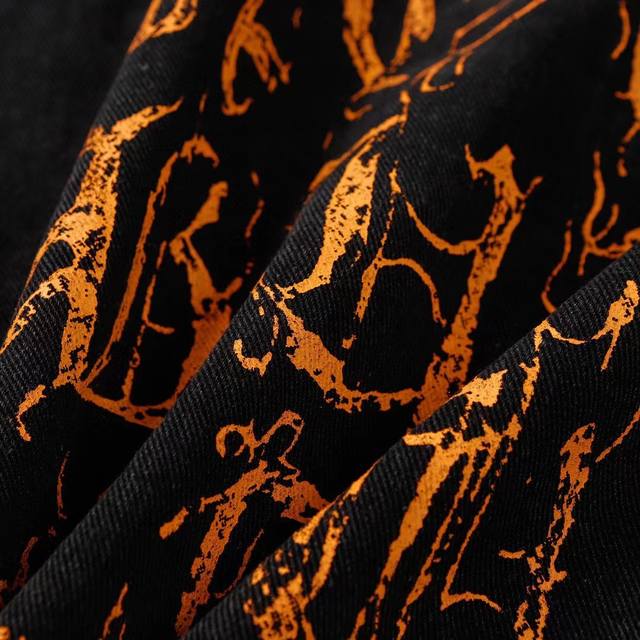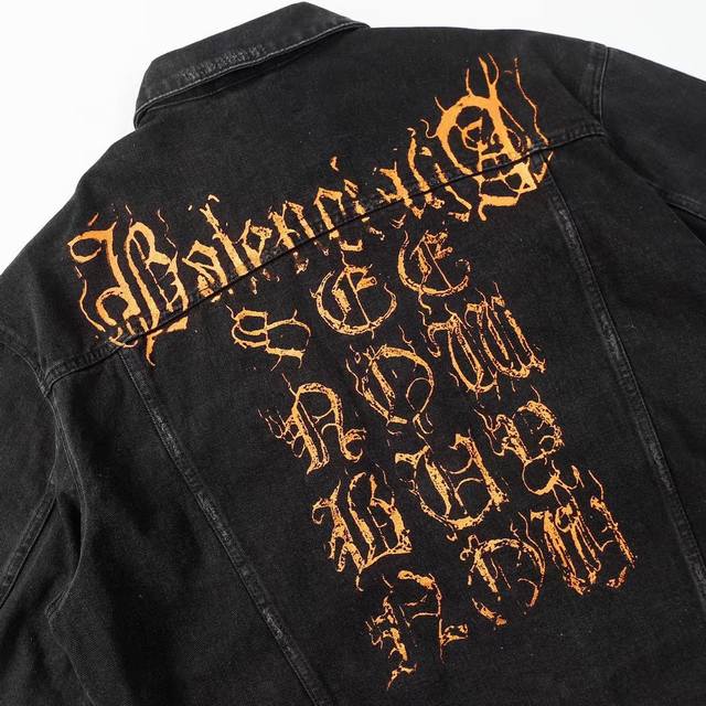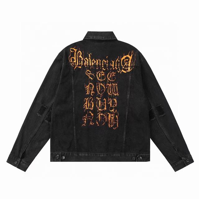 Heavy Metal Hoodi Flame Sanskrit Logo Print Washed Distressed Buttoned Denim Jacket