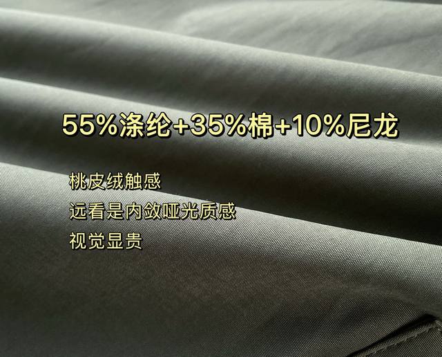 Fabric Texture | Peach skin texture for a luxurious look. Made with ultra-fine fiber velvet, the surface is as smooth and delicate as peach skin. From a distance, it appears matte, yet its softness becomes palpable up close. Made of 55% polyester, 35% cotton, and 10% nylon, it balances drape and durability.