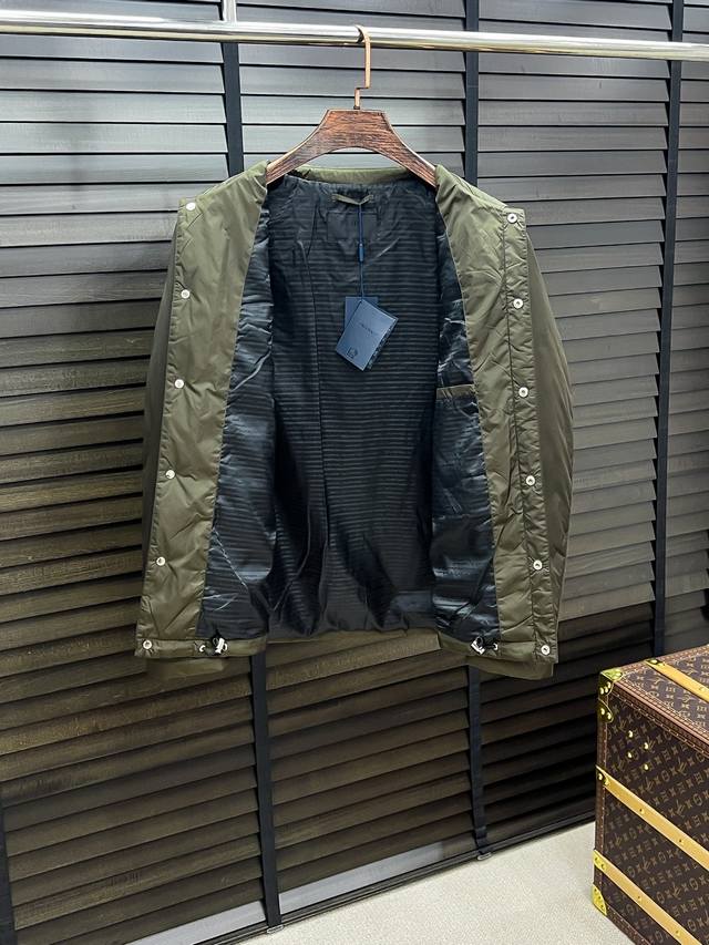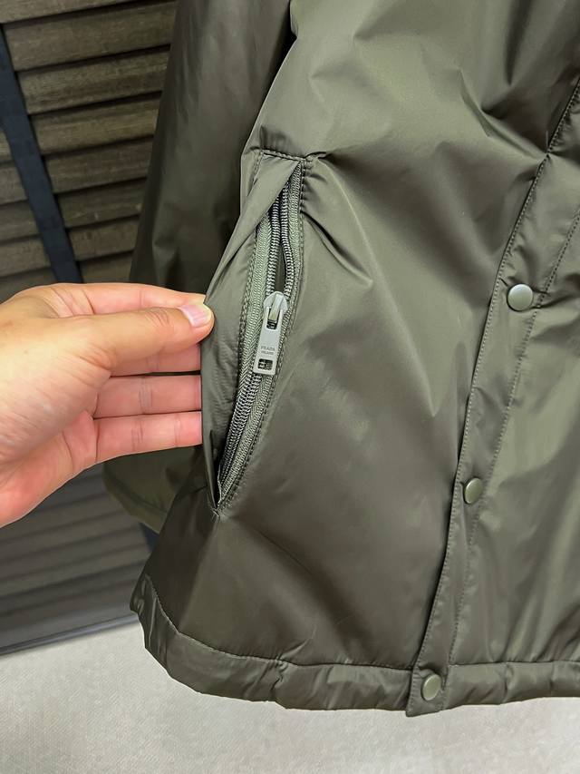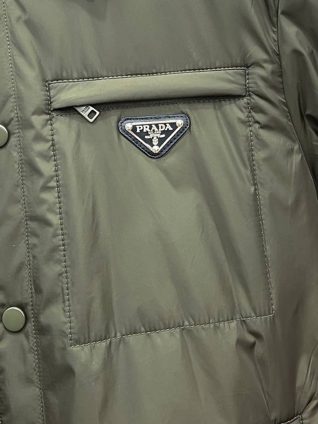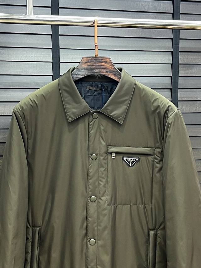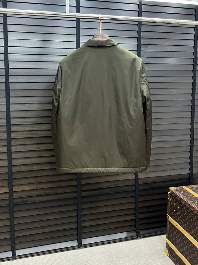 C-39 2025 Autumn/Winter Prada-Milano Triangle Badge Lapel Cotton-padded Jacket DDD Prada classic cotton-padded jacket, timeless... A stylish and practical cotton-padded jacket from the recycled nylon series, with a slightly loose fit and regular design. It also has a unique and fashionable style. Made of a polyamide nylon fiber cotton blend fabric, this garment boasts an extremely delicate and lightweight texture. It offers high elasticity, wrinkle resistance, windproofing, and warmth, providing comfortable support without feeling restrictive. The four-button closure on the placket adds a touch of sunny vitality. The spring-loaded hem adjustment design ensures perfect style and color control. Ideal for layering over T-shirts, shirts, and more... its irresistible charm is undeniable. The engraved hardware zipper exudes superior quality, and the new Milano logo badge showcases its premium feel. Available in black and green on the official website. Sizes: M, L, XL, 2XL, 3XL. Size Chart: M: Length 66cm - Chest 102cm - Shoulder Width 43.8cm - Sleeve Length 62.5cm - Hem 88cm.