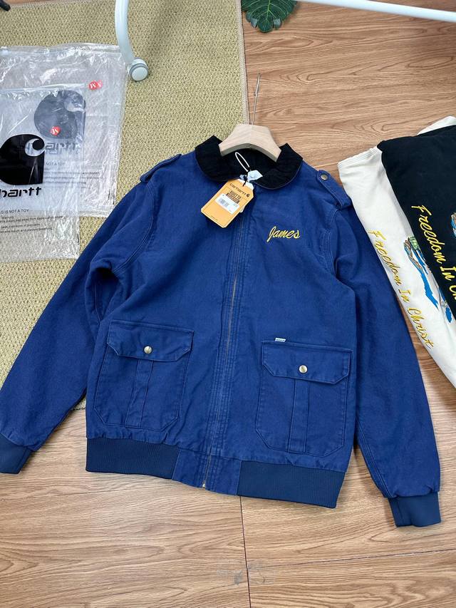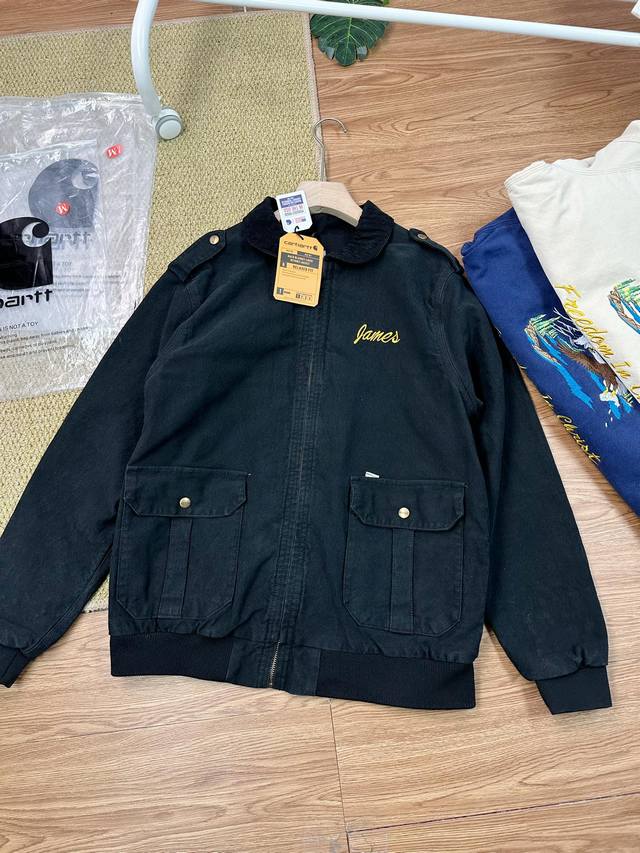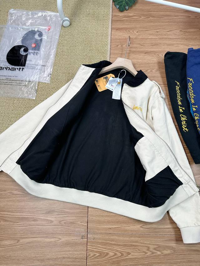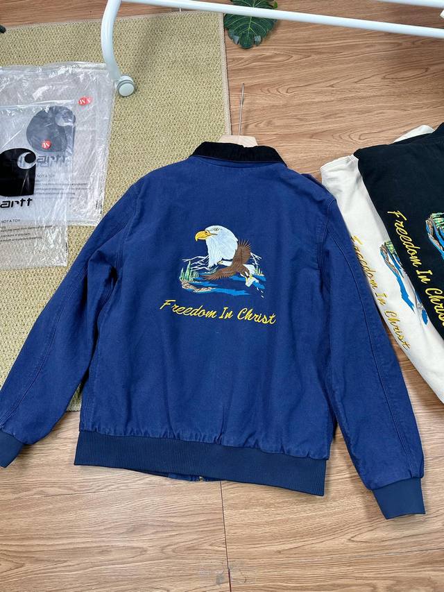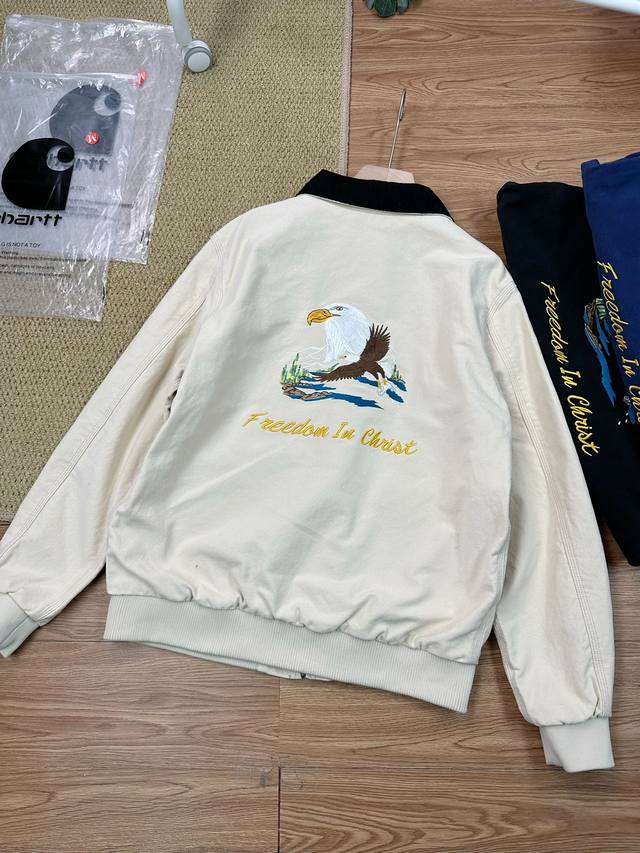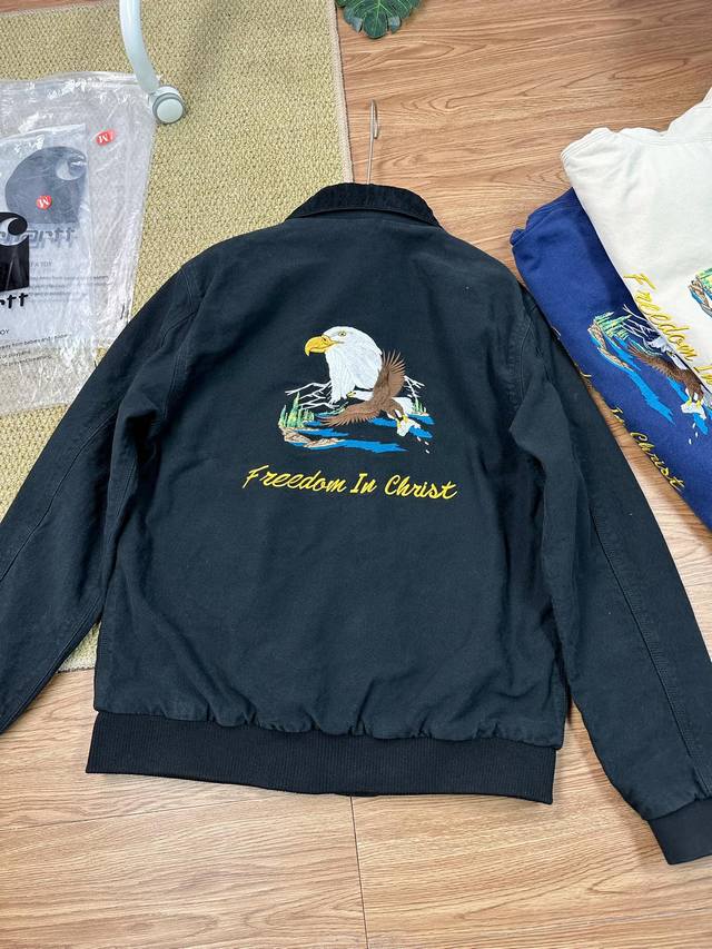 Carhartt spring jacket with heavy embroidery of an eagle on the back and contrasting lapel.