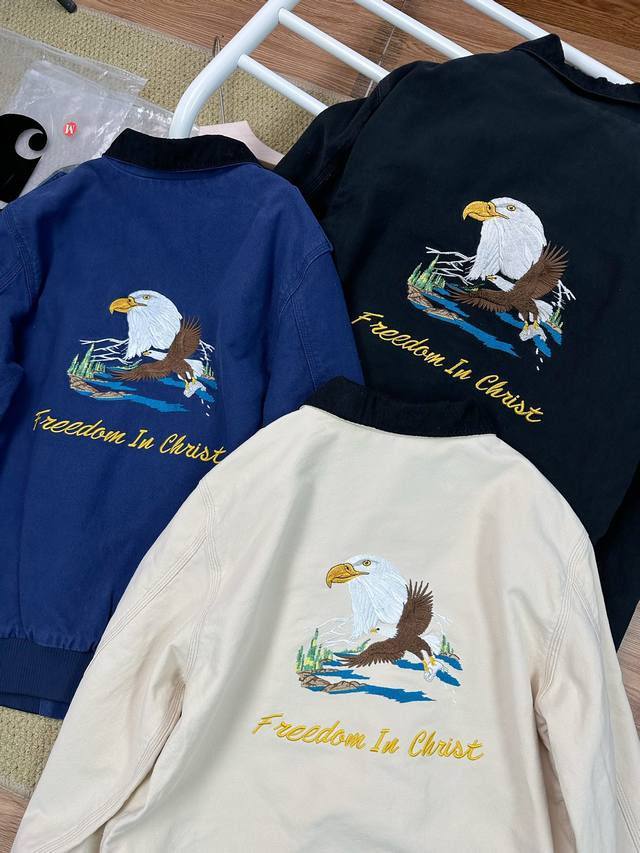 . Custom-woven high-density canvas fabric, heavily washed, with complex craftsmanship. One piece of clothing weighs up to 2 pounds. The upper body is stiff and drapey. Electroplated zipper. Small cursive embroidered logo on the chest. The eagle on the back is embroidered with 10,000 stitches, three-dimensional and full, lifelike details. All accessories are original and consistent. Loose fit.
