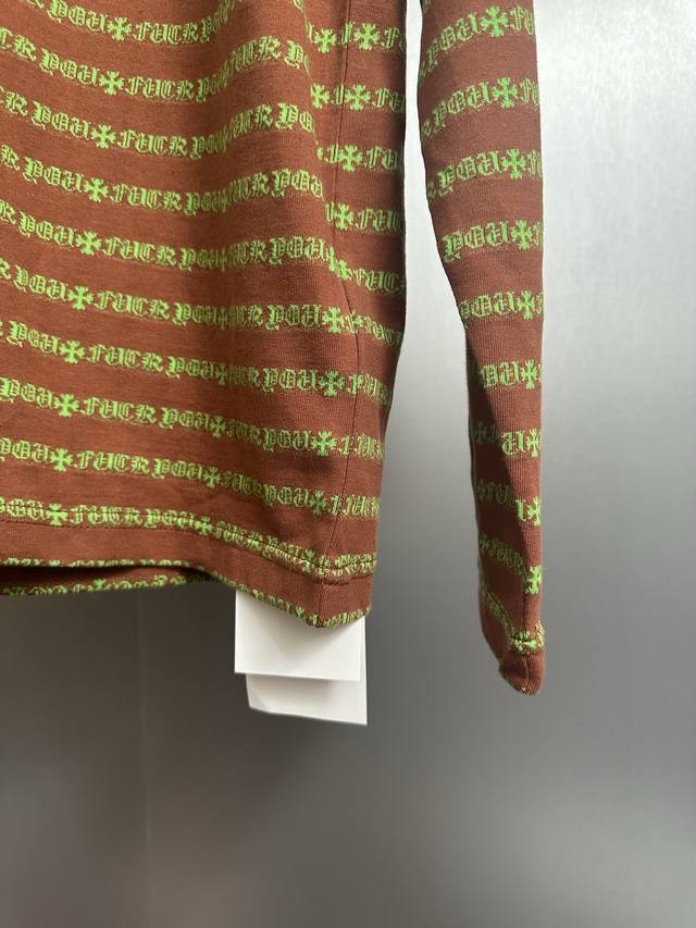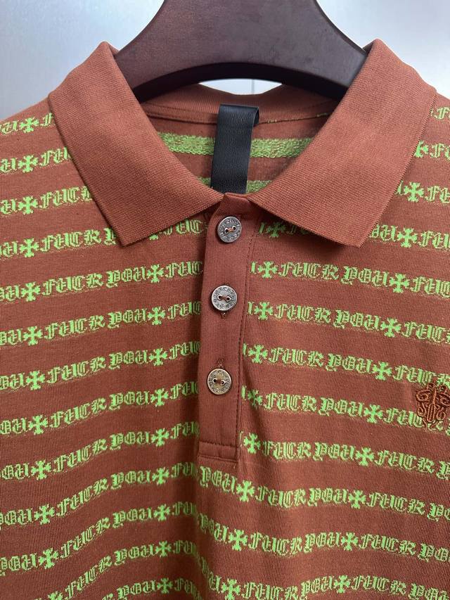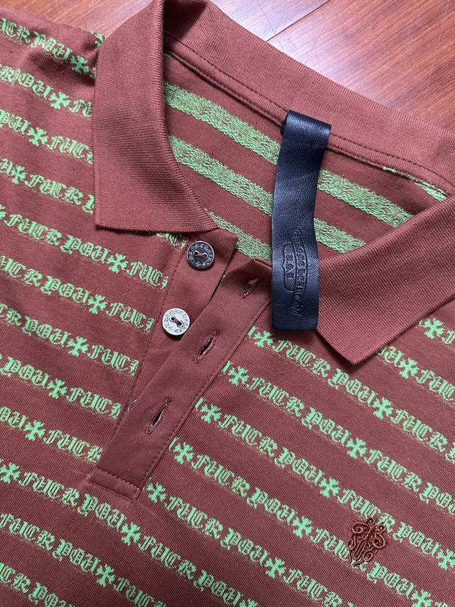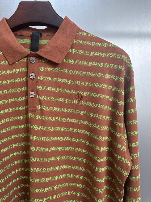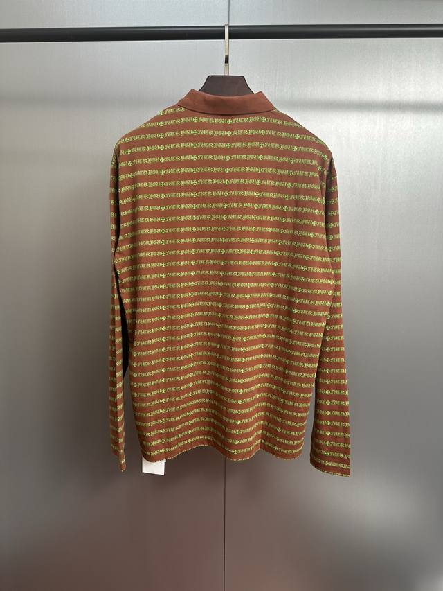 Ch 25 Cross Striped Polo Long Sleeve. Made with yarn-dyed fabric, minimum order quantity is 1000 meters, resulting in high costs. Embroidery uses imported Tajima embroidery machines, the collar patch is made of imported lambskin, and the hardware is genuine antique silver, making the cost extremely high. Colors: Brown, Yellow-Green. Sizes: S, M, L.