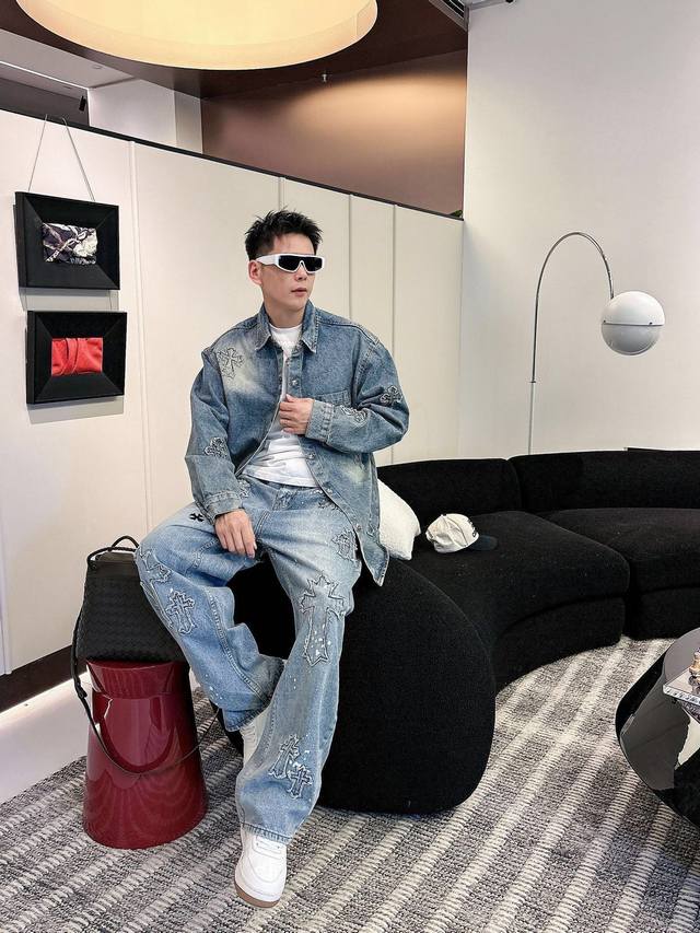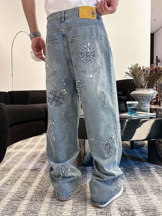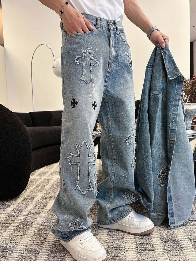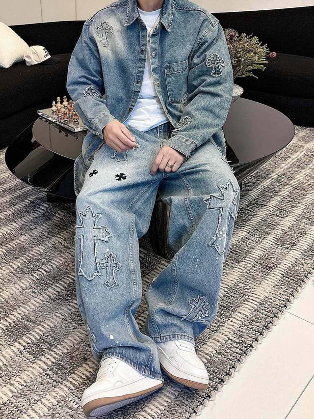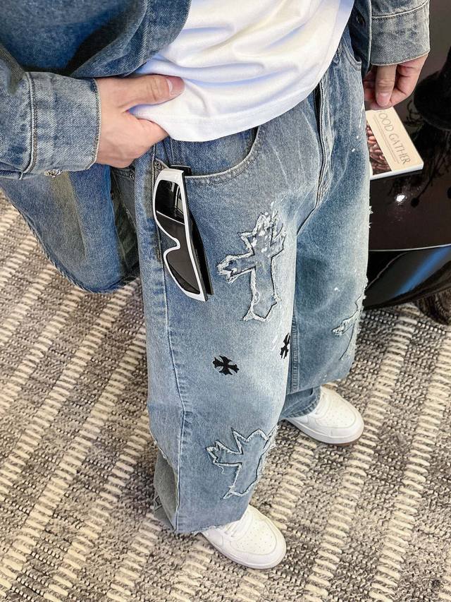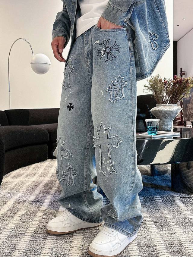 Cro denim distressed washed trousers with 3D embroidered cross patches on the front and back, exuding a high-end feel. This super popular item is here! The perfect piece for this weather. Cool, oversized, and unisex, full of personality, understated yet stylish, a perfect match! Made from heavyweight, chunky yarn 100% denim cotton with a heavy wash, ensuring a crisp and sturdy fit while being soft, comfortable, and breathable against the skin. The high-density embroidered Sanskrit letters are exquisite. The relaxed, loose fit is effortlessly chic. Unisex, easy to style and trendy. Sizes: S-3XL. Colors: Black, Blue. Style Number: 3751.
