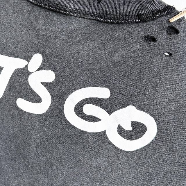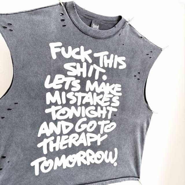 Cvt-19 Street Artist "Don't Worry Live in the Moment" Limited Edition Heavyweight Wasteland Style Distressed Vest with Reversed Neckline + Shoulder Overlock Stitching + Single Stitching at the Hem + Assault Fermented Wash + Multiple Cut-and-Distress Features Sizes: M L X L DDD Reversed Neckline + Shoulder Overlock Stitching + Single Stitching at the Hem + Multiple Cut-and-Distress Features + Heavyweight Assault Fermented Wash DDD The shoulders feature a special overlock stitching technique, a common technique in 90s vintage vests, which enhances the structural feel of the garment and makes it more three-dimensional and form-fitting. DDD
